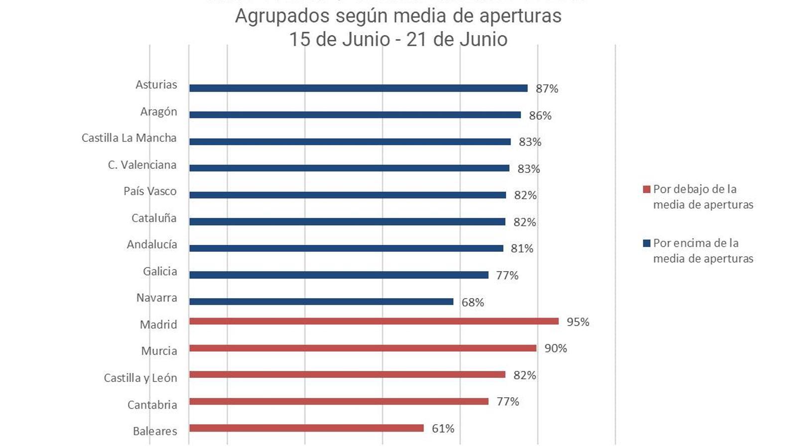 Baleares y Madrid siguen siendo las comunidades con menores aperturas, en el entorno del 40%. Cantabria, algo rezagada hasta la semana anterior, reacciona muy favorablemente y se alinea con la media nacional.