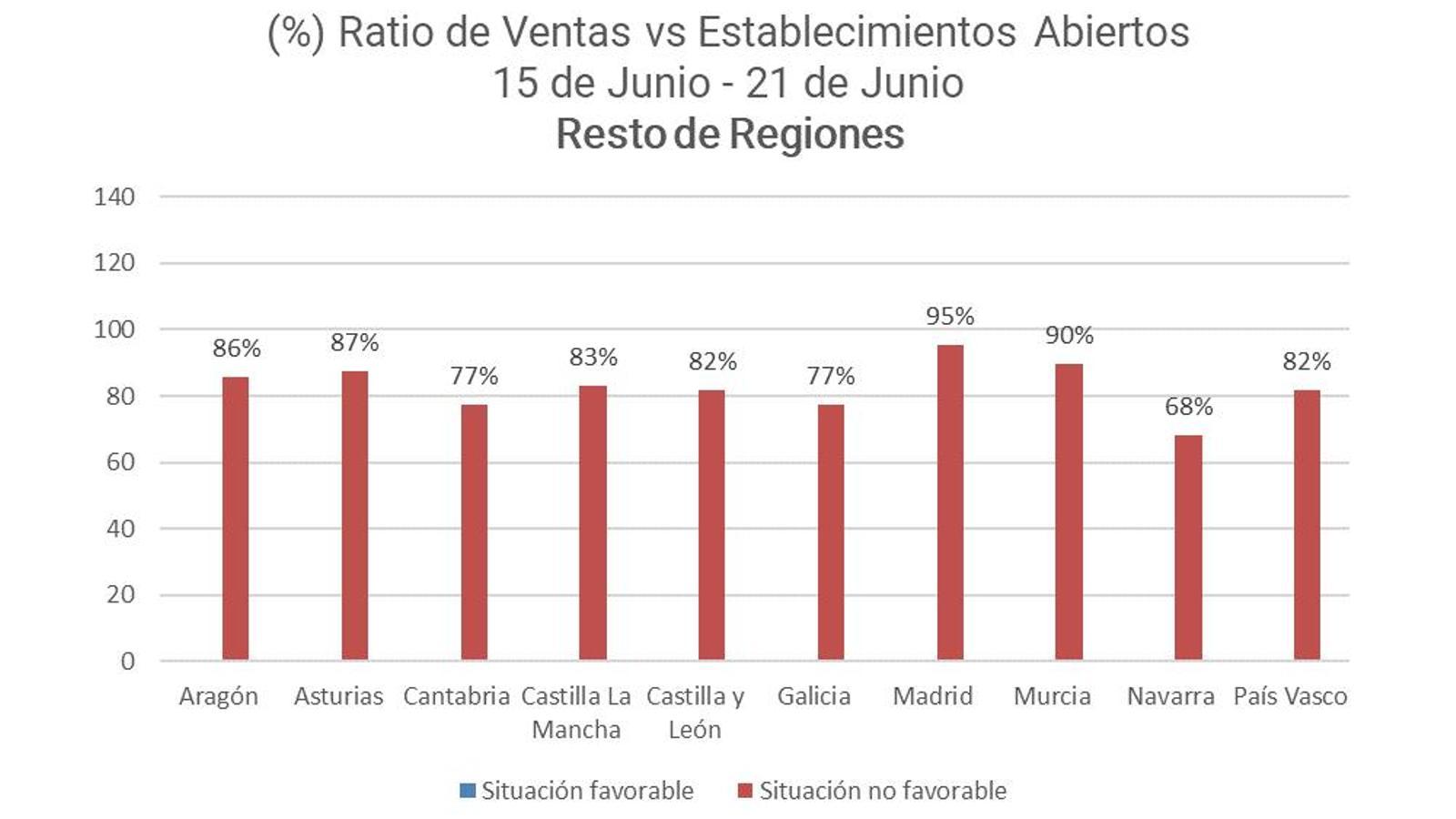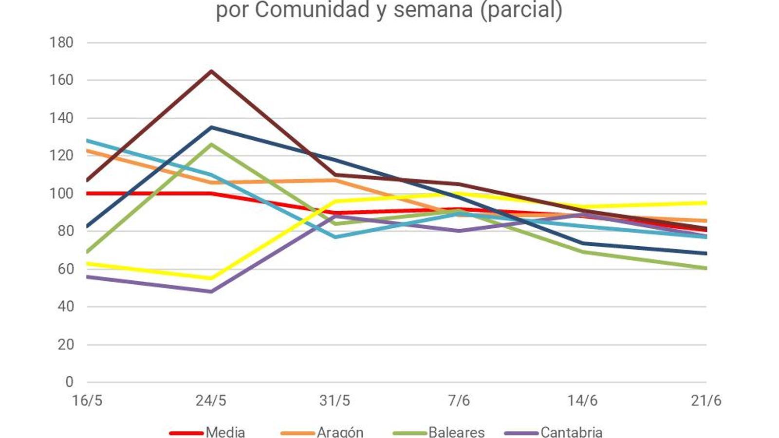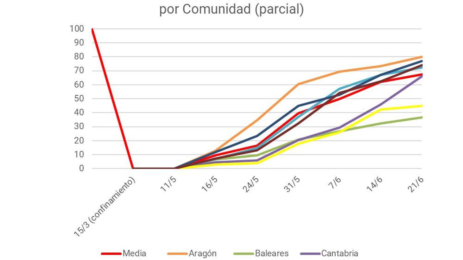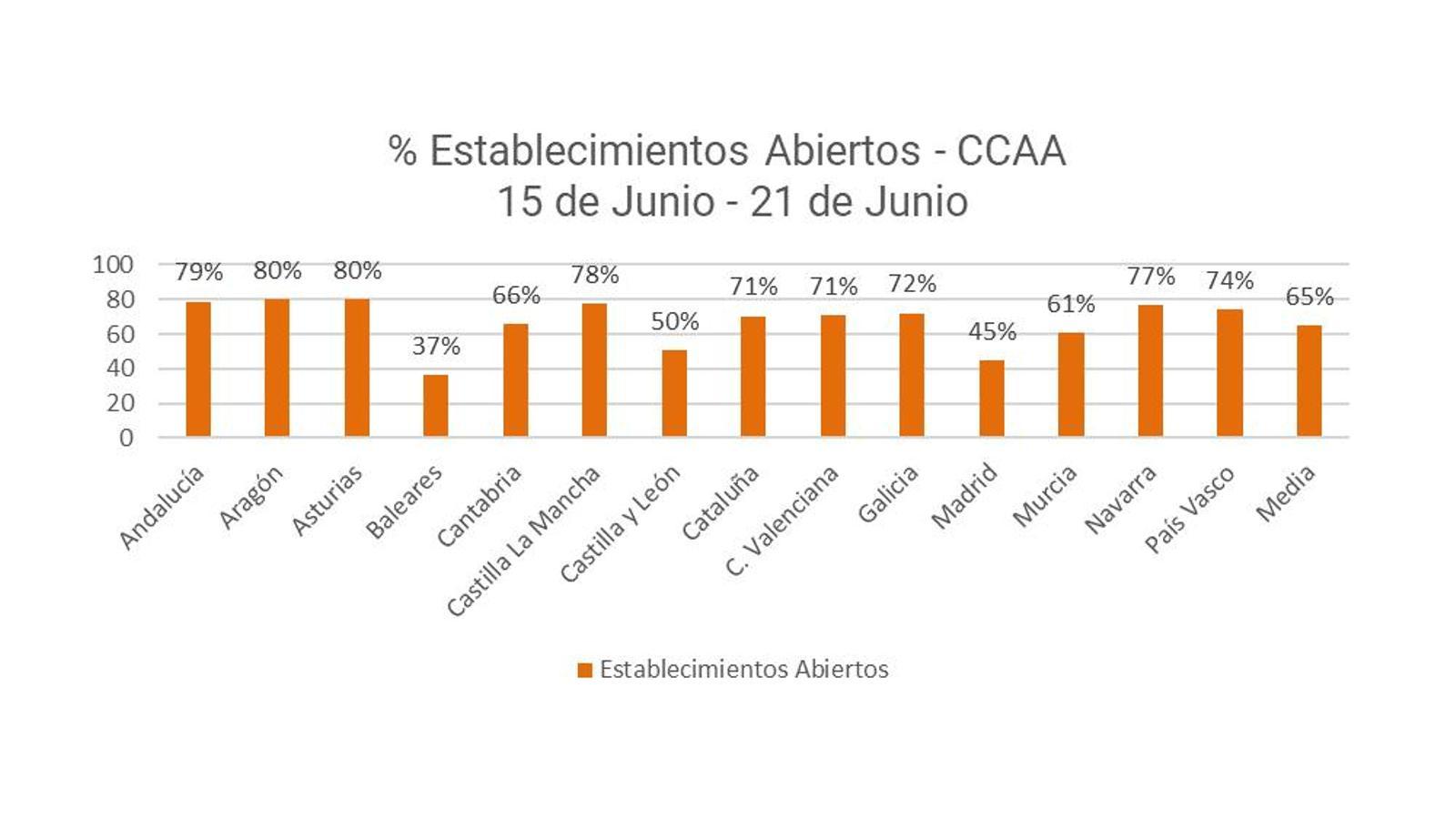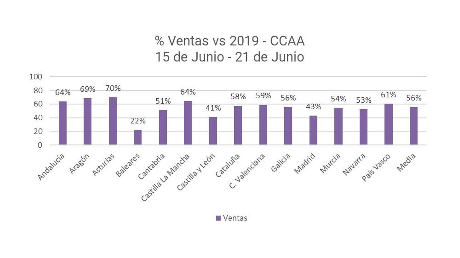 Varias comunidades autónomas presentan un desarrollo de negocio muy bajo, especialmente Baleares (22%), Castilla y León (41%) y Madrid (43%). En la semana del 15 al 21 de junio siguen destacando Aragón (69%) y Asturias (70%).