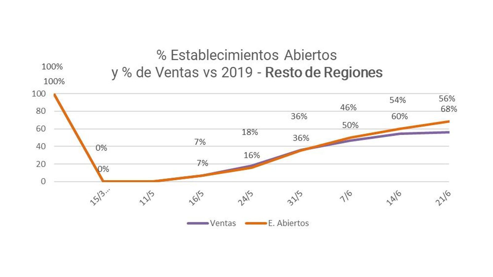 En esta gráfica pueden apreciarse varios efectos. El más visible, el efecto positivo de las primeras aperturas, con valores de venta por encima de lo previsible (es el caso de Cantabria, Navarra y Baleares). También es manifiesta la progresiva convergencia de todos los valores por debajo de los de las ventas -lógico- del año anterior.
