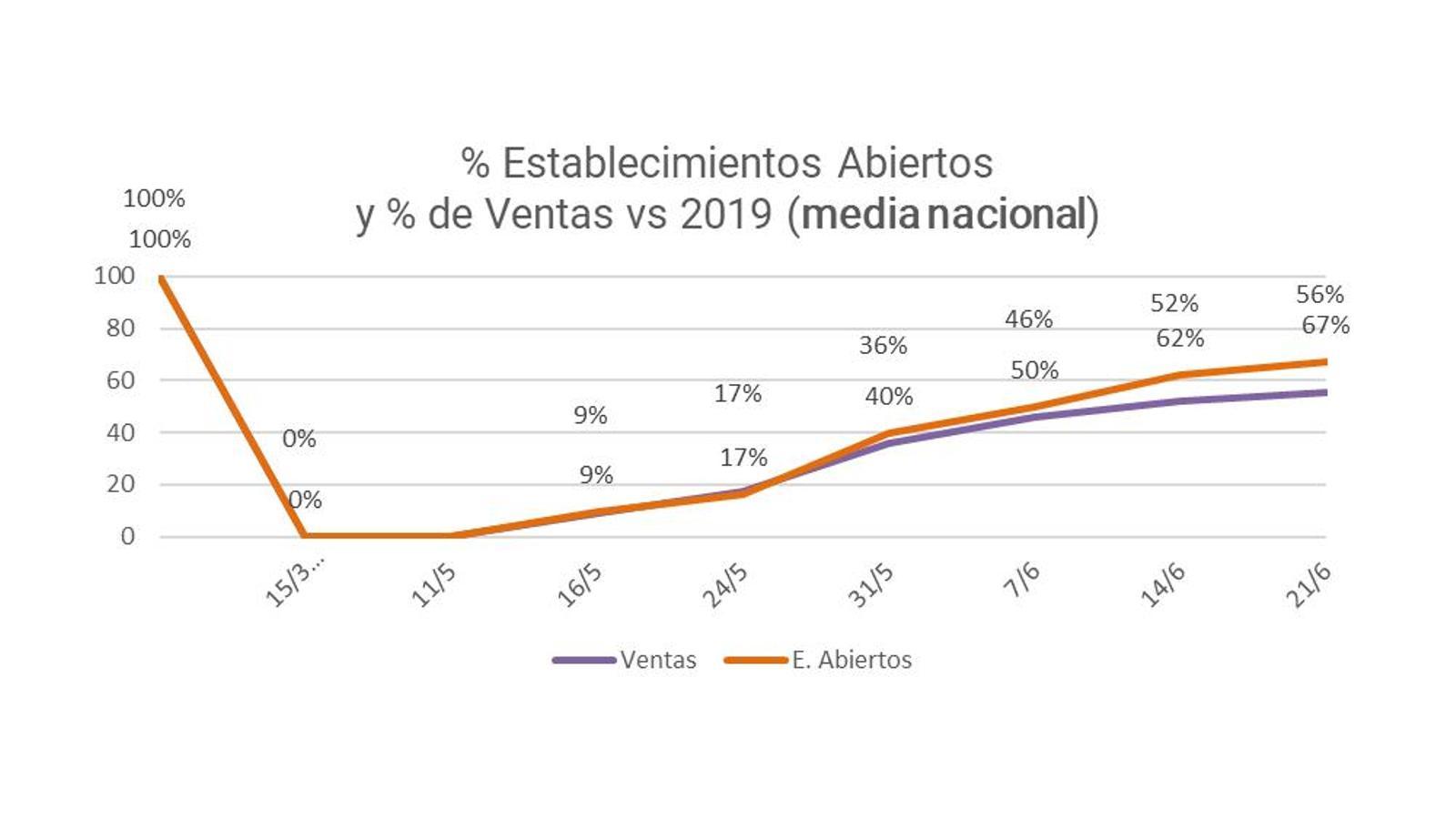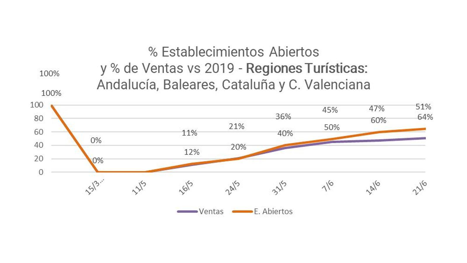 - Empieza a observarse una cierta ralentización de las ventas a medida que se van abriendomás negocios. Resulta más difícil obtener buenos resultados con capacidades de aforo y ocupación restringidas (en comparación con los datos del año anterior).Las aperturas han pasado de un 62 a un 67%, pero las ventas han crecido únicamente 4 puntos.