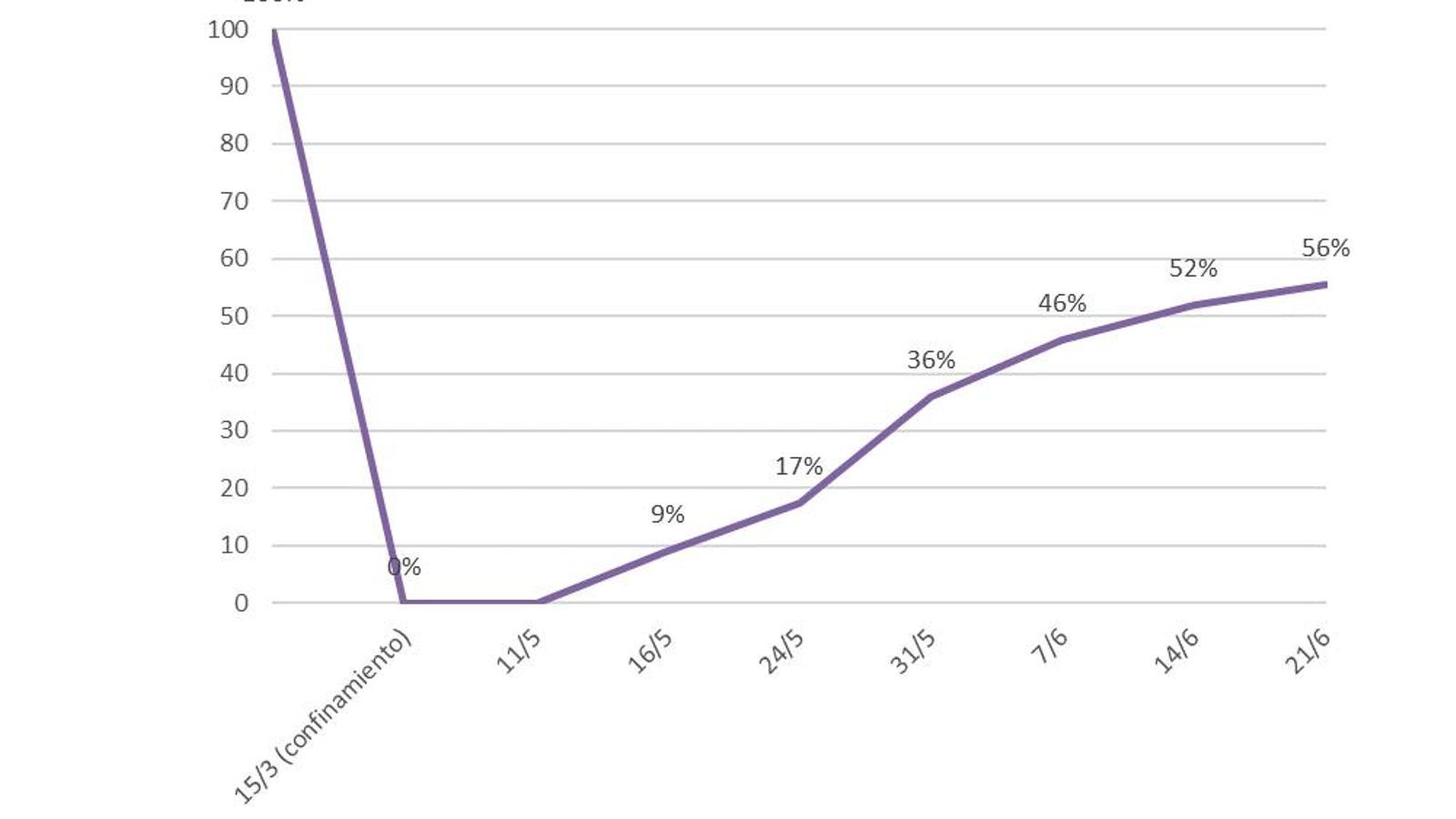 En esta sección analizamos en primer lugar la relación entre las aperturas y el volumen de compra. Ambos porcentajes deberían coincidir a medida que se avanza en la desescalada: al 10% de establecimientos abiertos debería corresponder un volumen de compras del 10%, al 20% de aperturas, el 20% de facturación y así sucesivamente.