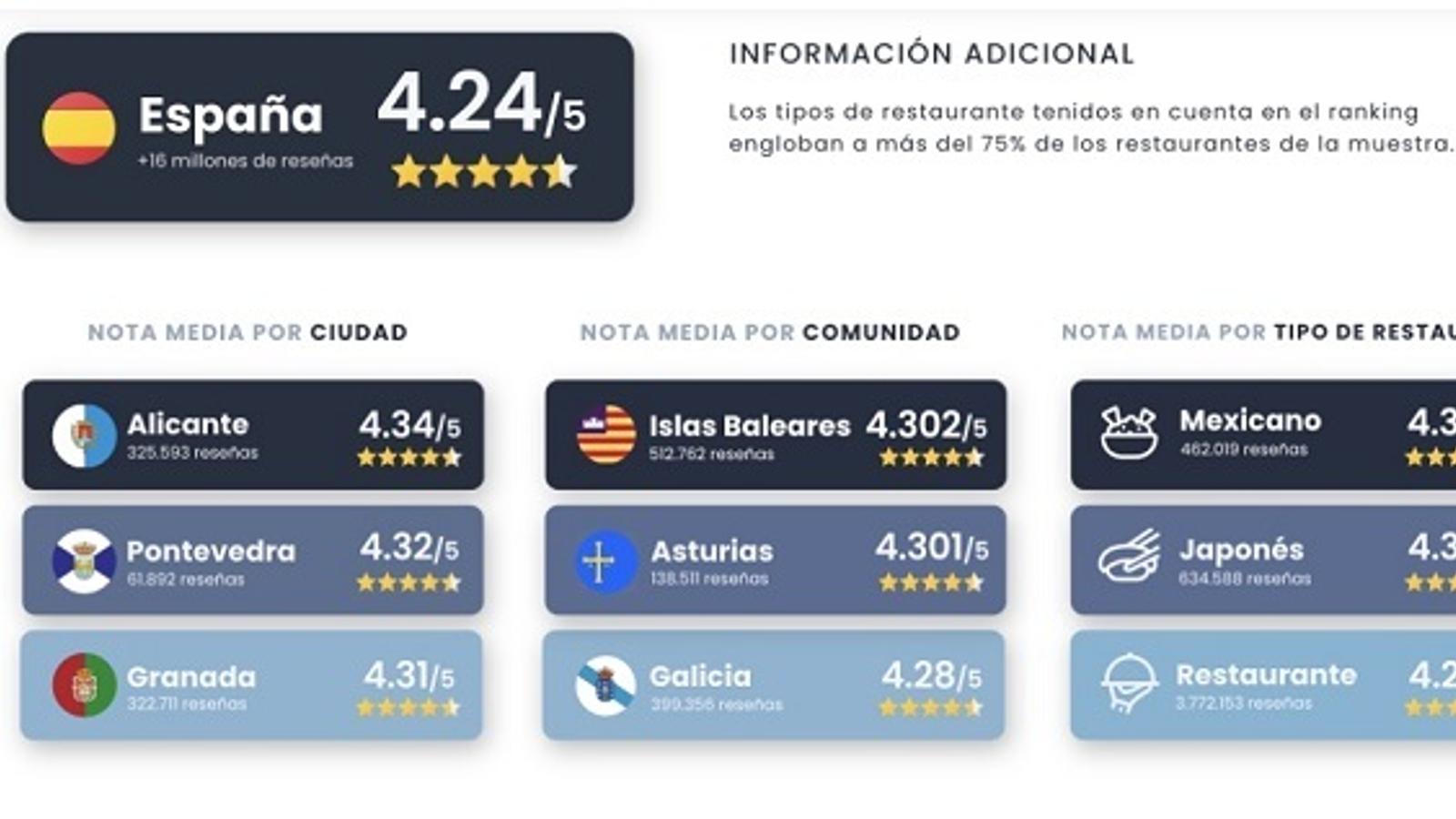 Los negocios de Alicante, Pontevedra y Granada son los mejor valorados por los clientes, con notas que superan los 4,3 puntos. En cuanto a regiones, Baleares, Asturias y Galicia son las que ocupan las primeras posiciones.