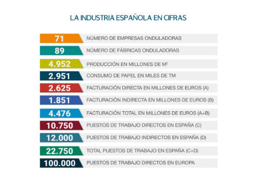 La facturación total del sector, tanto directa como indirecta, alcanzó el año pasado los 4.476 millones de euros con un total de 71 empresas onduladoras y 89 fábricas de este material en toda la geografía española. Estas emplearon en 2016, entre puestos de trabajo directos e indirectos, a más de 22.750 trabajadores. En Europa, la cifra de puestos directos ascendió a 100.000.