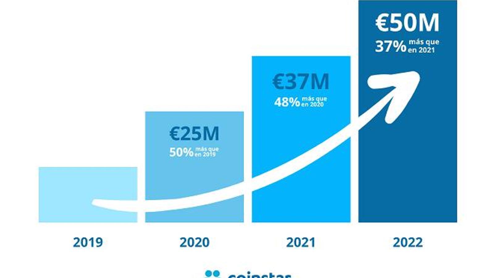 Más de 1.200.000 usuarios han utilizado uno de los quioscos de esta firma durante 2022, el 30% más que en 2021 y el doble de usuarios que en 2020. En total, más de tres millones de consumidores ya han usado este servicio para cambiar sus monedas por cupones. Además, el promedio de monedas canjeadas por transacción ha aumentado hasta situarse en 43 euros.