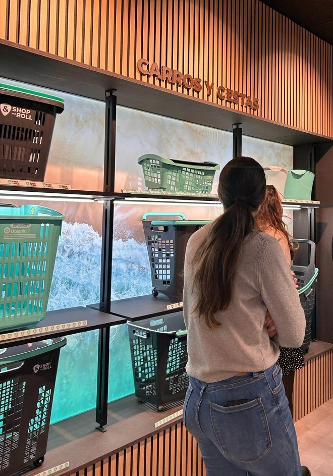 El showroom está dividido en varios universos que recrean otras tantas secciones comerciales: alimentación autoservicio, mercado tradicional, mascotas, cosmética o parafarmacia. También cuenta con un espacio dedicado a exponer la gama de equipamiento para transporte en tienda, con sus cestas con asa telescópica y ruedas y los carros de compra compactos.