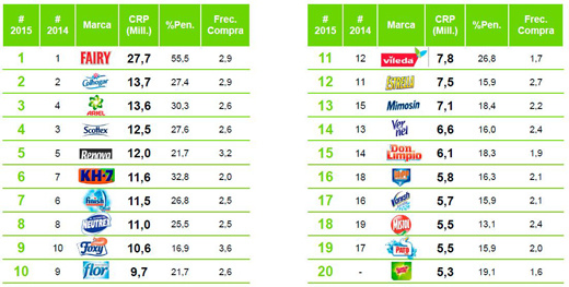 Tras este top 10, se encuentran marcas como Vileda, Estrella, Mimosín, Vernel, Don Limpio, Wipp Express, Vanish, Mistol, Pato y Scotch-Brite.