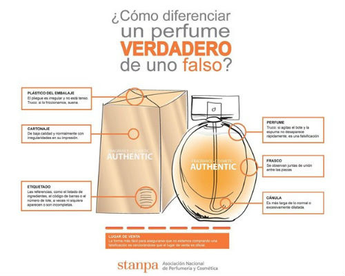 Por su parte, el responsable jurídico de Stanpa, Fernando Magariños, indica que detectar las falsificaciones no es una tarea fácil y requiere tener el original para contrastar. Pese a ello, conviene vigilar si el perfume tiene espuma, ver si la cánula es más larga que el bote o está dilatada, si se observan las juntas del cristal del envase, si los pliegues del plástico son irregulares, si el cartón del embalaje es de baja calidad o si el etiquetado es inexistente o está incompleto, características que tienen los perfumes falsificados.