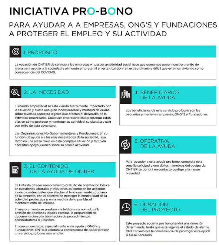 Ontier, el despacho global de abogados, ha lanzado una iniciativa probono dirigida a las pequeñas empresas, ONG y fundaciones, para favorecer las consultas de forma gratuita a todas estas empresas que lo puedan necesitar ante la situación excepcional que vivimos con la crisis del coronavirus COVID-19.