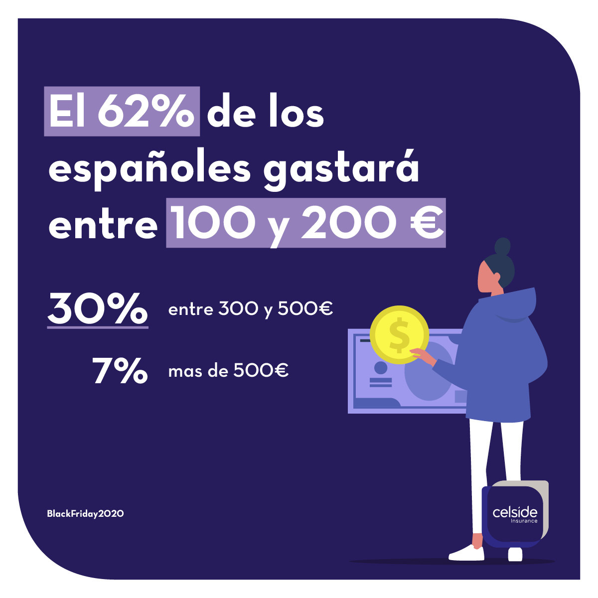 Este año, el importe medio que los españoles prevé gastar en el Black Friday está entre los 100 y 200 euros. Así lo afirma el 62% de los españoles encuestados mientras que el 30% declara que gastará entre los 200 y los 500 euros, un presupuesto similar al del año pasado. Comprando en esta fecha señalada el 76% de los encuestados considera que ahorrará entre 100 y 200 euros, mientras que el 18% opina que el ahorro estará entre los 200 y los 300 euros, y solo el 5% opina que puede llegar a ahorrar más de 500 euros.