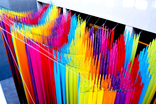 “Es un proyecto en el que crearemos una atmósfera de tiras de papel cuya ligereza será destacada por el movimiento provocado por la corriente. Haremos que nuestra instalación cobre vida en cada punto del recinto a través de la creación de luces y sombras que, sobre los grises del edificio, combinarán a la perfección con los llamativos de colores del papel Renova”, han explicado.