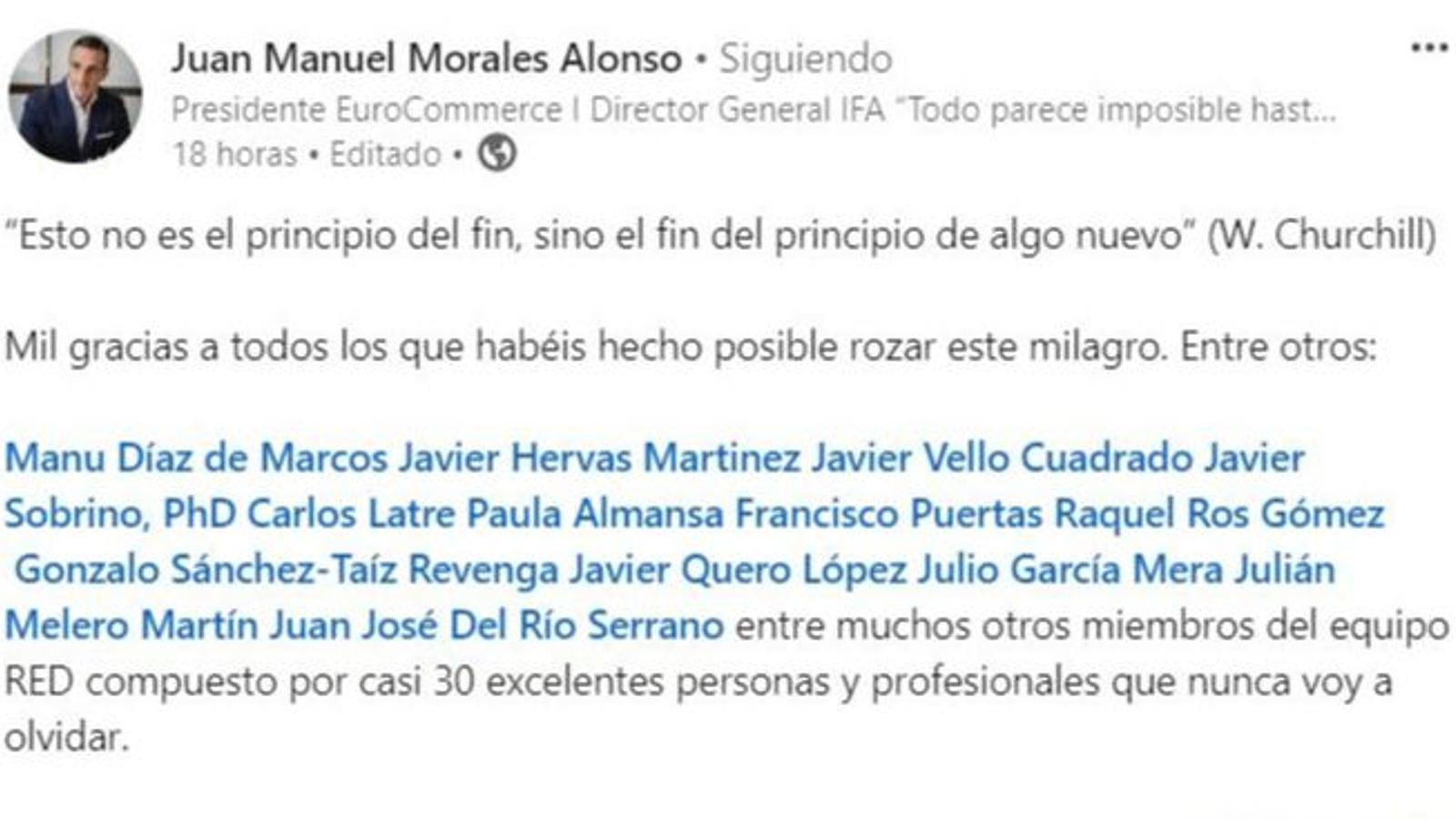 En todo caso, parafraseando a Winston Churchill, el directivo ha recalcado en su cuenta de LinkedIn que "esto no es el principio del fin, sino el fin del principio de algo nuevo" y ha incidido en dar "mil gracias a todos los que habéis hecho posible rozar este milagro". También ha manifestado su convencimiento de que "la valiente apuesta por el cambio que la sociedad sigue demandando a la RFEF se hará realidad, tarde o temprano".