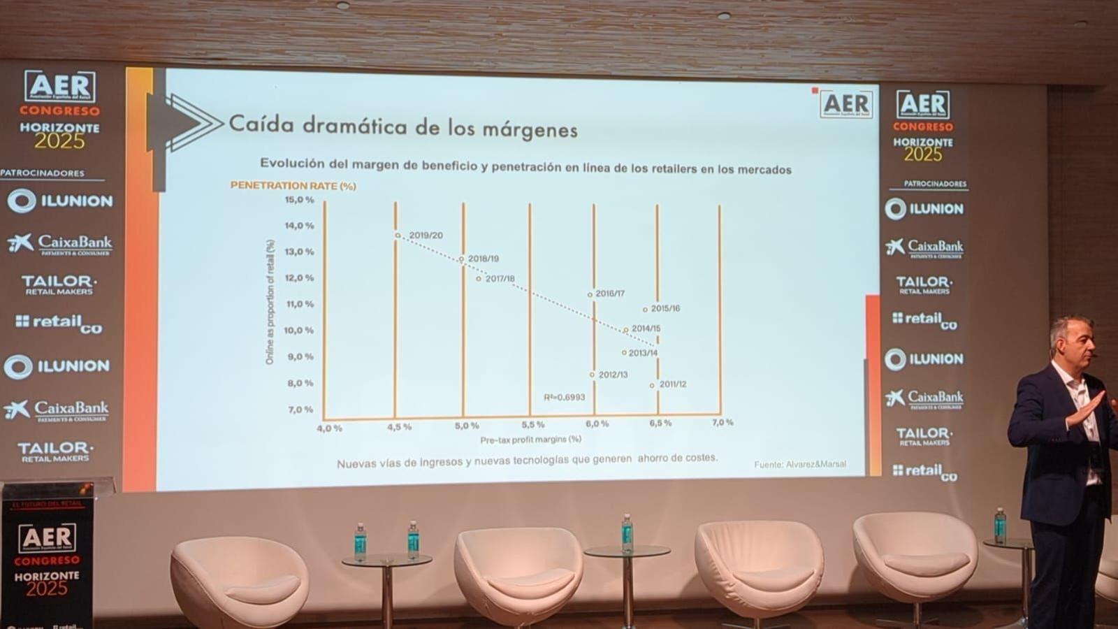 El fundador de la AER añadió que, “aunque no a todos les fue mal, se produjo una caída dramática de los márgenes. No estábamos preparados para la omnicanalidad: en la medida que penetraba el comercio electrónico, cayeron los márgenes de los 100 primeros retailers, según desvela un estudio de la consultora Álvarez & Marsal, de los más interesantes que he visto en los últimos años”, añadió el fundador de la AER.