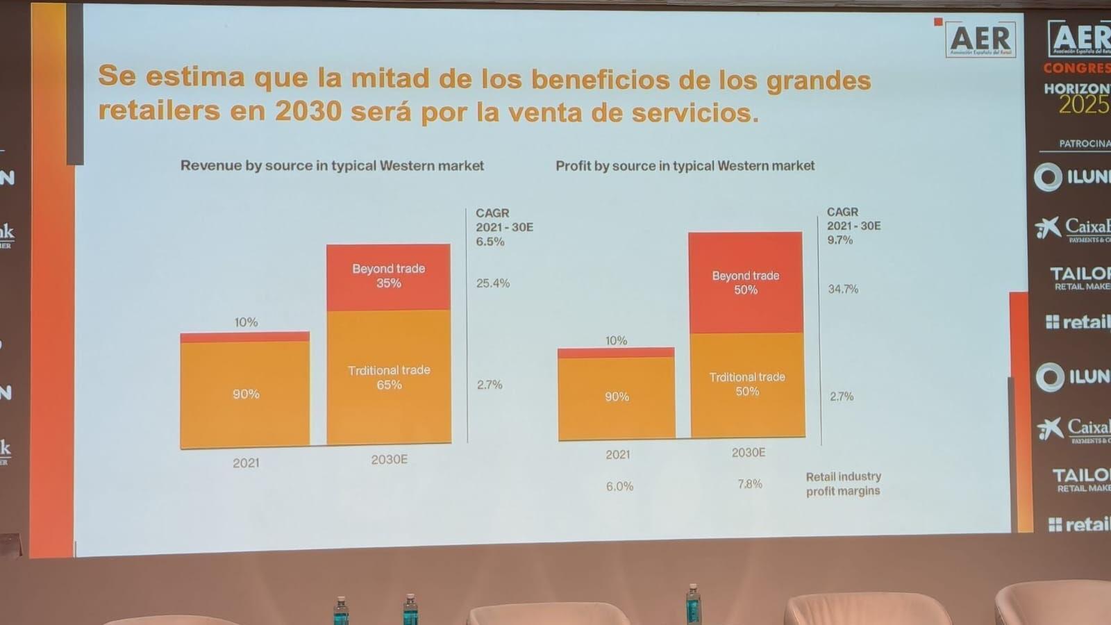 Otra de las tendencias confirmadas por estudios de varias consultoras apuntada por Turienzo es la de tratar de compensar la caída de márgenes con otro tipo de ventas: “Los retailers venderán cada vez más cosas que no tengan que ver con mercadería; se estima que la mitad de los beneficios de los grandes retailers en 2030 será por la venta de servicios”, concluyó el fundador de la AER.