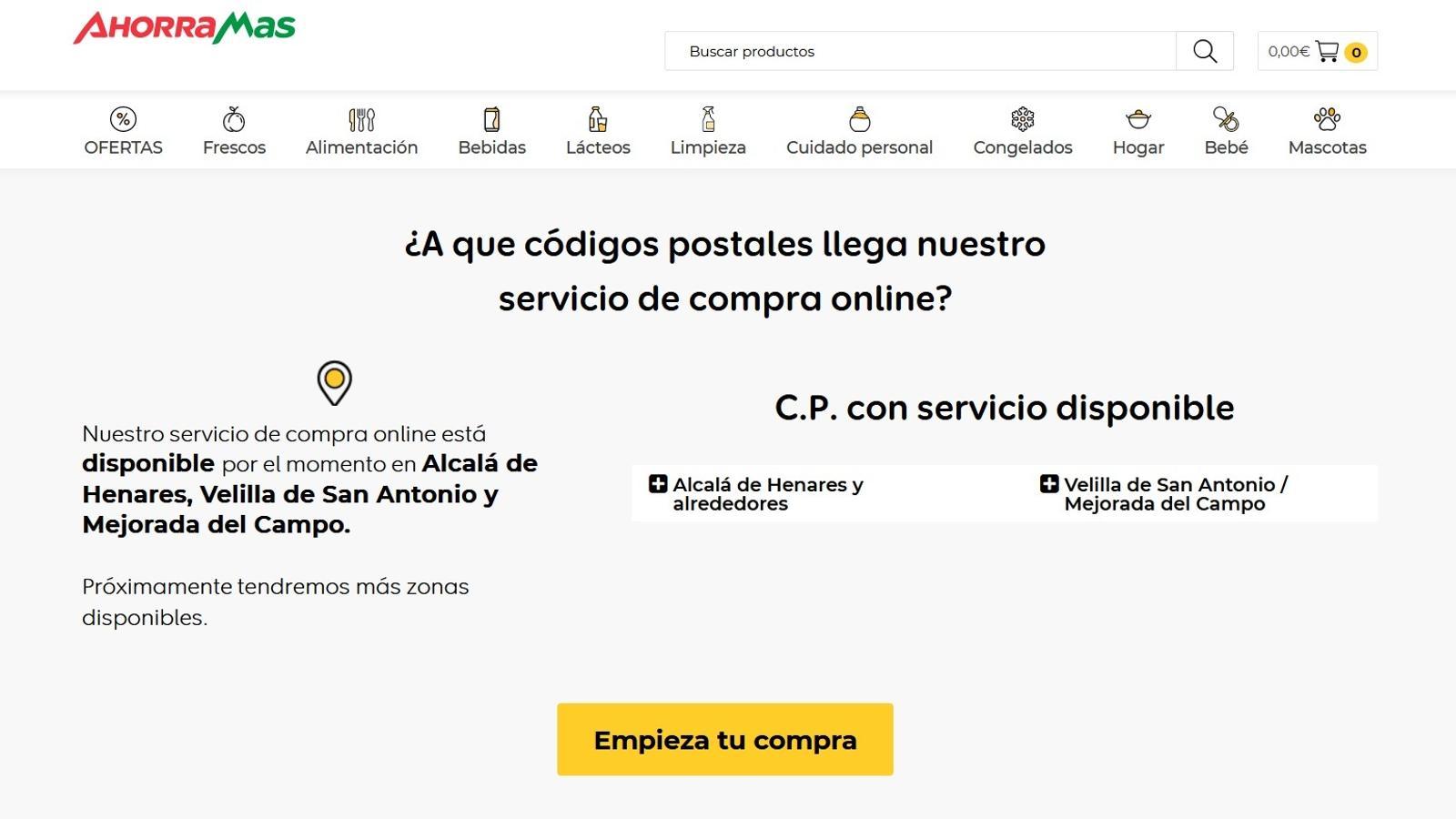 Por otro lado, la página web de Ahorramas permite consultar por zonas dónde está disponible la venta online. Se trata de un buscador en el que se introduce el código postal y, seguidamente, se indica si esa zona dispone del servicio o no. En caso de que no, se puede introducir un correo donde se recibirá un aviso cuando el reparto llegue a ese código postal.