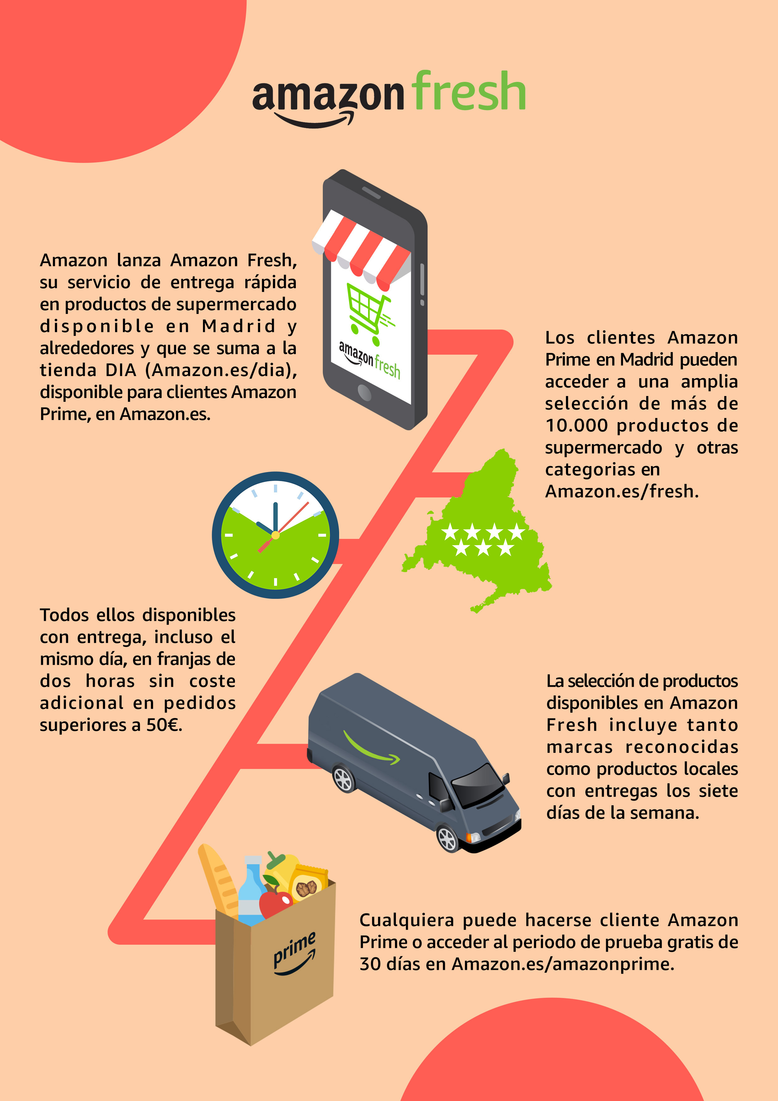 El objetivo de la compañía de Jeff Bezos es ofrecer un servicio de entrega rápida a domicilio. De este modo, los clientes Amazon Prime redidentes en Madrid y alrededores pueden realizar su compra entre más de 10.000 artículos en Amazon.es/fresh, entre los que se incluyen productos frescos y congelados, carne, pescado, frutas y verduras, lácteos, aperitivos, artículos de primera necesidad -todo para la compra de la semana-, así como productos de belleza y cuidado personal, juguetes y artículos de papelería.