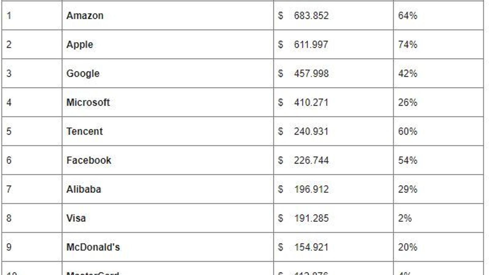 Las 10 marcas principales están valoradas actualmente en 3,3 billones de dólares, frente a los 800.000 millones en 2011. Amazon se mantiene como la marca más valiosa del mundo con un crecimiento del 64% alcanzando los 684.000 millones de dólares (o el PIB equivalente de Polonia). Desde la primera vez que entró en el ranking en 2006, el valor de Amazon ha aumentado casi 268 mil millones de dólares y se ha convertido en la primera marca de medio billón de dólares, junto a Apple, en segunda posición y valorada en 612 mil millones de dólares. La marca tecnológica es, de hecho, la que mayor crecimiento ha logrado del Top 10 de marcas más valiosas del mundo, con un incremento del 74%. Este año, la tercera posición la ocupa Google quien, con un crecimiento del 42 % hasta alcanzar los casi 458 mil millones de dólares, consigue superar a Microsoft (#4) cuyo valor es de 410.271 millones de dólares. Finalmente, el Top 5 lo cierra Tencent, quien continúa escalando posiciones desde el 7 ostentado el año pasado.