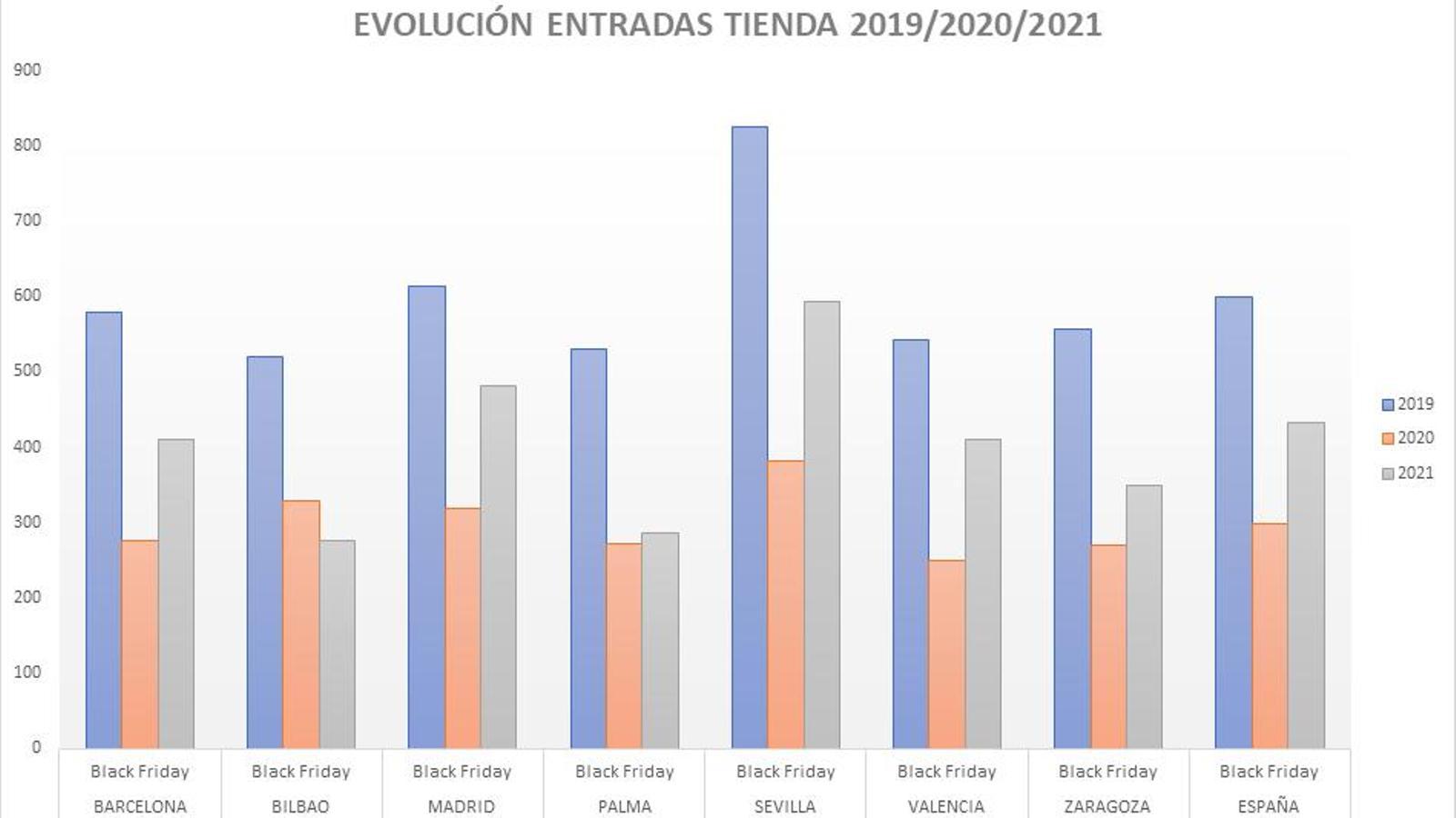 Muestra de que los modelos de consumo están cambiando la da el hecho de que apenas se note diferencia -en lo que respecta a las entradas en tiendas- durante las diversas semanas de noviembre. La media semanal española (248 entradas por día y negocio) se ha mantenido sin demasiadas ondulaciones desde el 1 al 28 de este mes. De hecho, a diferencia de lo que podría pensarse, la semana que experimentó una mayor afluencia en los establecimientos fue la primera del mes, con 9 clientes más que la del Black Friday: 254 vs. 245. Esta dinámica, claro está, no se ha respetado en todas las ciudades. En Bilbao la semana más exitosa ha sido la tercera -del 15 al 21- y en Palma el premio ha recaído en la segunda -del 8 al 14-. Sea como sea, en ninguna de las siete ciudades analizadas, la última semana de noviembre, que incluye el que se ha convertido en el día más famoso de la temporada prenavideña, ha sido la triunfadora.