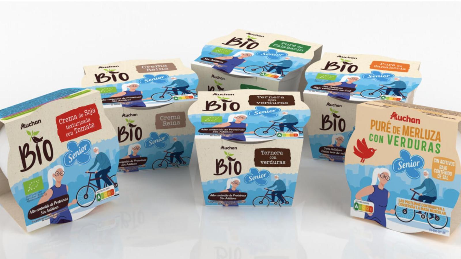 La gama MDD Auchan Senior, pensada para atender las necesidades de los consumidores de edad más avanzada. Se trata de una selección de seis cremas ligeras de varios sabores (puré de merluza con verdura, crema reina, crema de soja textura con tomate, puré de calabacín, puré de zanahoria y crema de ternera con verduras), elaboradas en colaboración con nutricionistas del CDTI y la Universidad de Cádiz. La gama destaca por ser fácil de cocinar y masticar, además de ser baja en sal y calorías.
