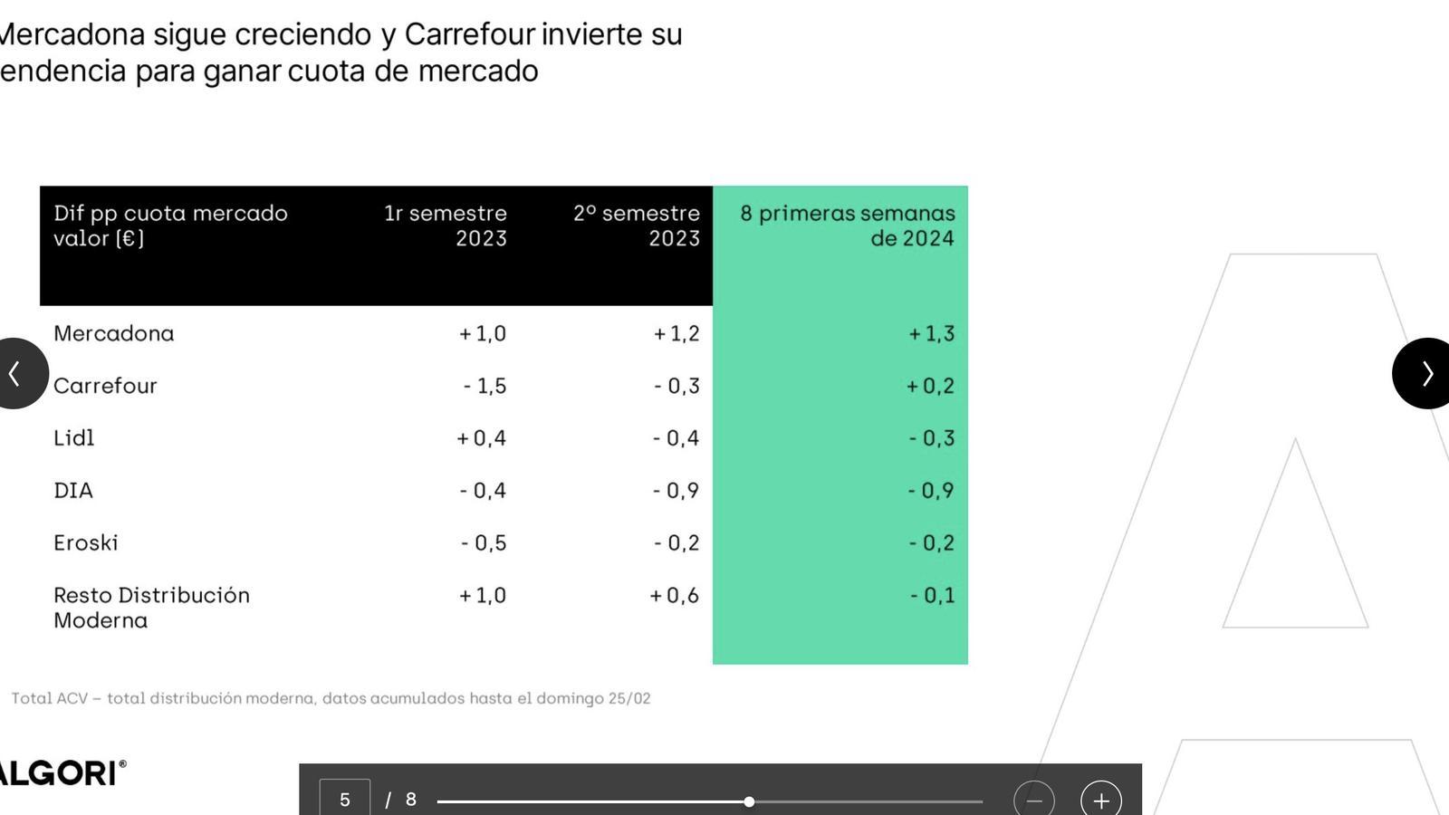 Carrefour revierte la tendencia y consigue ganar cuota de mercado durante las ocho primeras semanas de 2024, demostrando que hay vida más allá del surtido corto. Así lo ha confirmado Cugat Bonfill, director de Insights en Algori, que avanza una recuperación general del sector a medida que la inflación pierde fuelle.