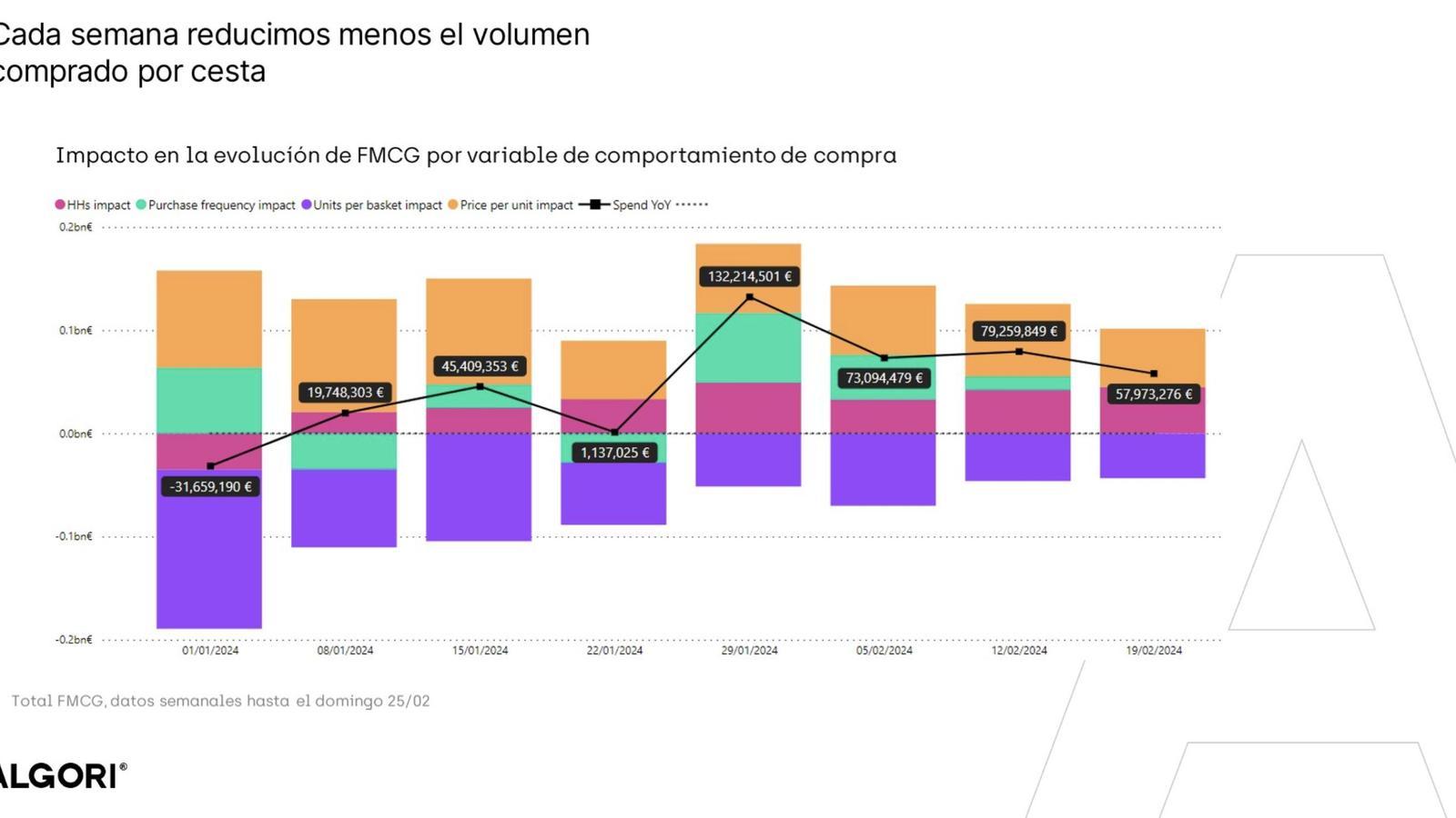 En cuanto a la evolución general de precios, éstos siguen desacelerándose, lo que ha permitido que se recupere el volumen de compra por cesta (si bien sigue en negativo en términos interanuales). A cierre del segundo periodo de 2024 (semanas 5 a 8), el crecimiento del sector se encuentra en el +4% interanual.