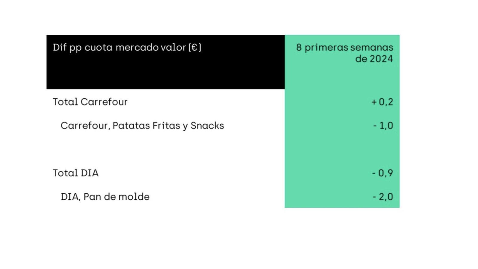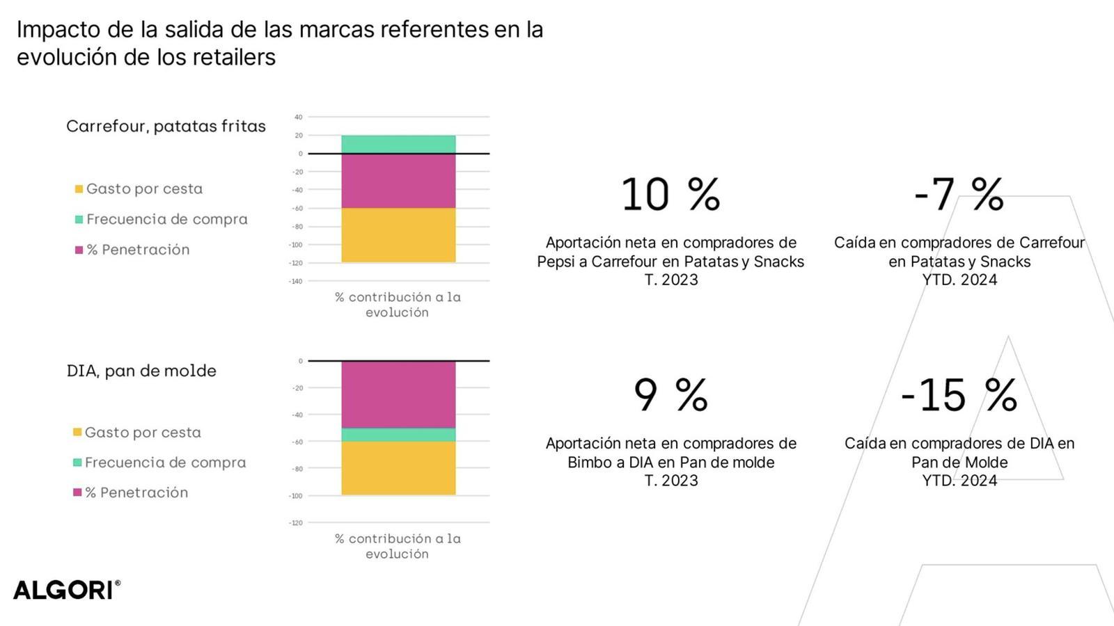 Por otro lado, Carrefour y Grupo Dia han visto empeorar sus resultados en las categorías de snacks y pan de molde debido a sus respectivas guerras con Pepsico y Bimbo.