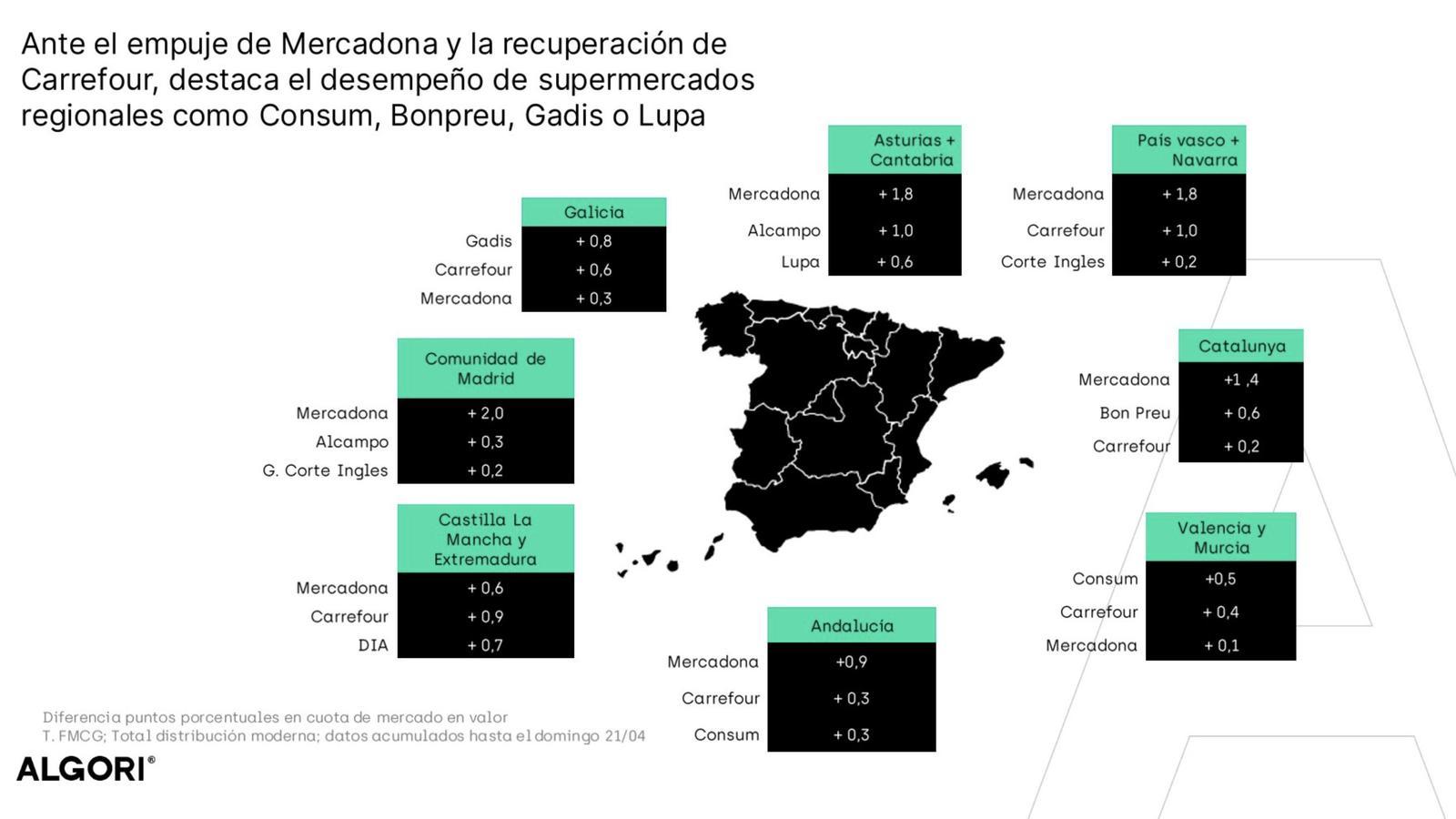 En Cataluña, Bon Preu crece el 0,6%, por encima de Carrefour (+0,2%), si bien a aún cierta distancia de la enseña que preside Juan Roig, que crece el 1,4%. En Asturias y Cantabria, Lupa es la tercera enseña que más crece (+0,6%), sólo por detrás de Alcampo (+1,0%) y Mercadona (+1,8%), mientras que Gadis logra imponer su ritmo en Galicia (+0,8%), donde es la primera enseña por delante de Carrefour (+0,6%) y Mercadona (+0,3%).