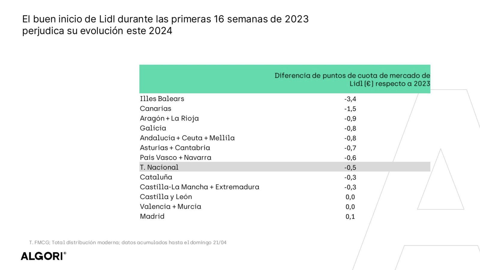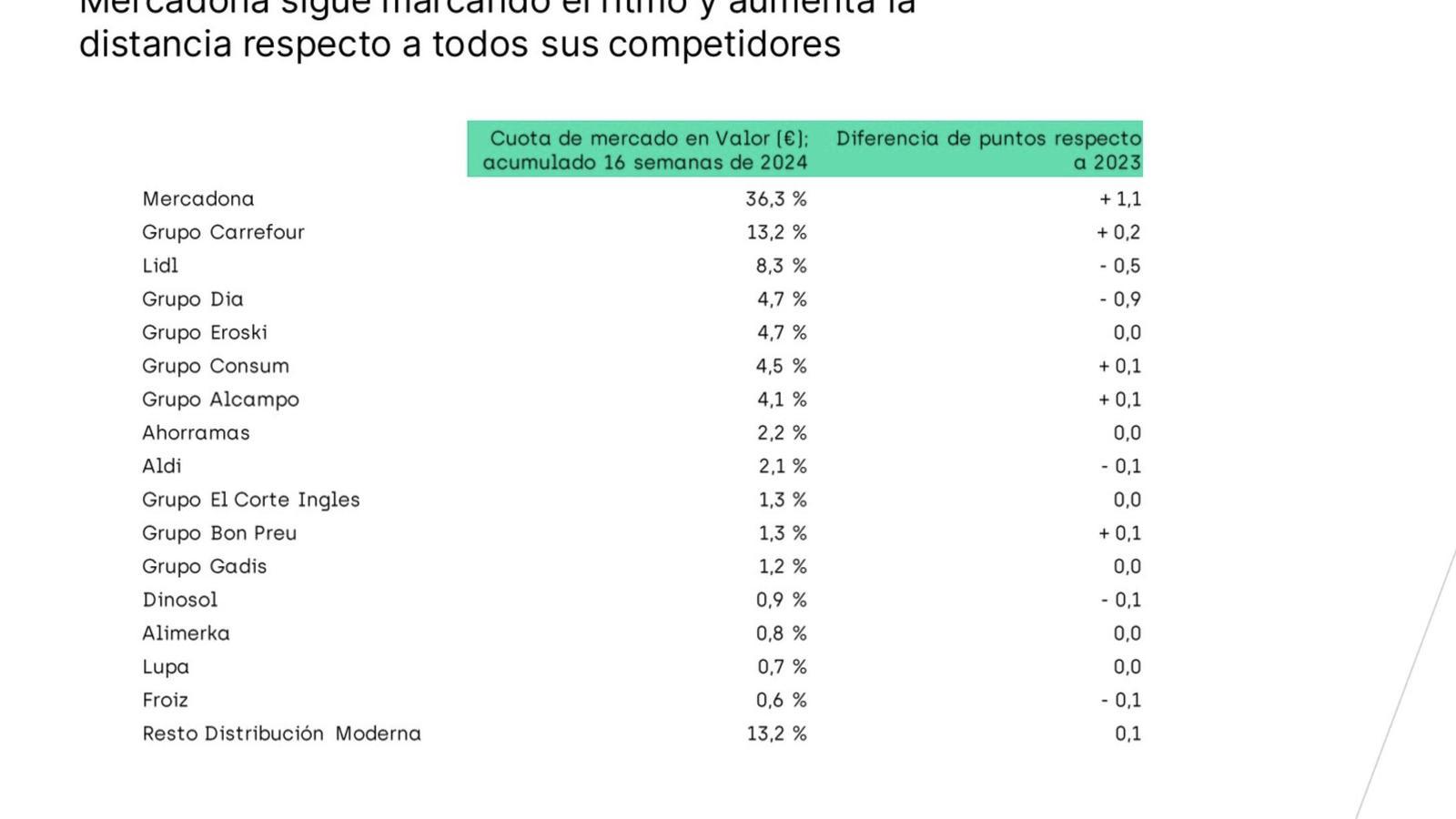 En el conjunto del país, Algori otorga a Mercadona una cuota de mercado en valor del 36,3%, el 1,1% más respecto a 2023. Carrefour ocupa el segundo lugar con el 13,2% de cuota (+0,2%) y Lidl completa el podio con el 8,3%, si bien sufre un retroceso de cinco décimas respecto al año pasado.