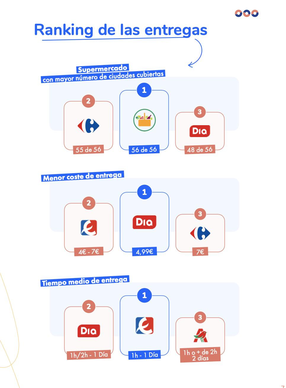 En cobertura le sigue de cerca Carrefour (55 ciudades), que está reconvirtiendo sus hipermercados en centros de preparación de pedidos. Además, la enseña francesa ocupa el tercer lugar en costes de entrega más baratos (7 euros).
