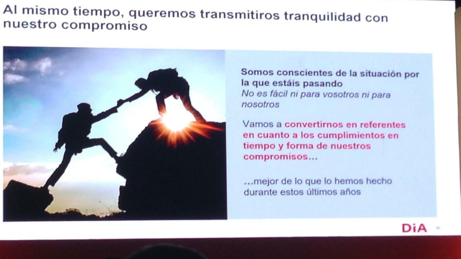 El encuentro se ha convertido en todo un ejercicio 'purificador' de asunción de errores, concretamente los cometidos por la anterior directiva de Dia que han llevado a la compañía a la situación en la que se encuentra: pérdida de clientes; tendencia negativa de ventas; deterioro de la marca; pérdida de competitividad; empeoramiento de la relación con proveedores e incluso el reconocimiento del 'estrés' al que está sometido el sistema de franquicias.