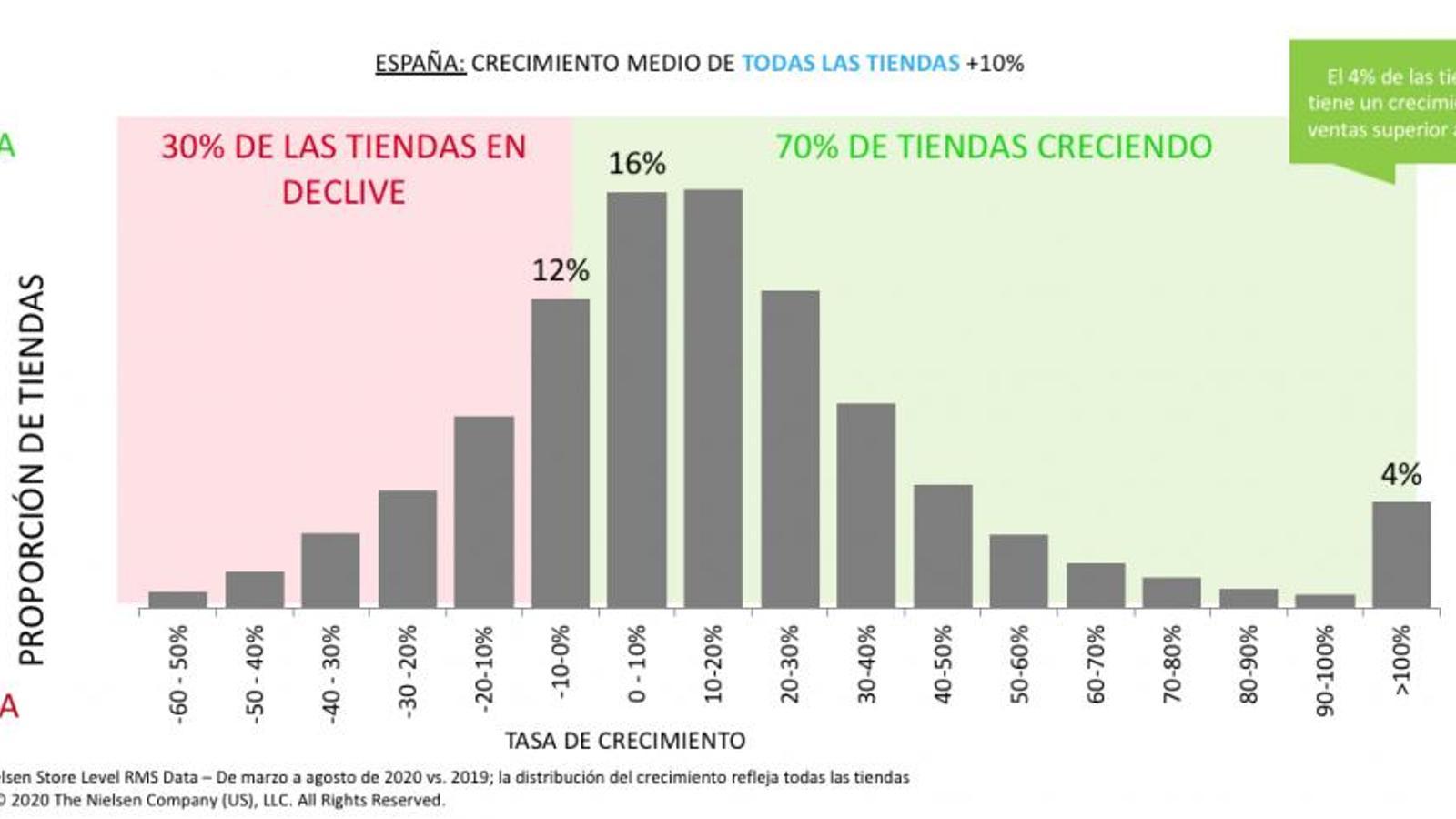 Las ventas acumuladas en gran consumo en España entre marzo y agosto crecieron de media un 10%, según Nielsen. Sin embargo, casi una tercera parte de las tiendas tuvieron una caída en ventas y, por el contrario, entre aquellas que tuvieron una dinámica más positiva (el 70% restante), el 4% tuvo un excepcional crecimiento por encima del 100%.