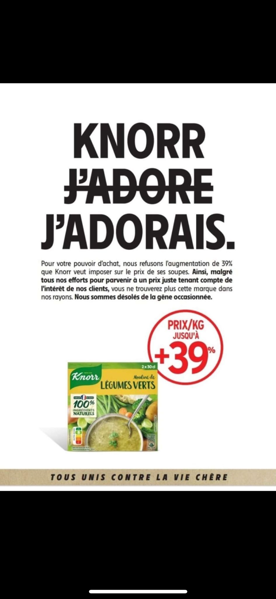 Debajo incluye el siguiente mensaje explicativo: "Por su poder adquisitivo, rechazamos el aumento del 39% que Knorr quiere imponer al precio de sus sopas. Por eso, a pesar de todos nuestros esfuerzos por llegar a un precio justo teniendo en cuenta los intereses de nuestros clientes, ya no encontrarás esta marca en nuestros lineales. Sentimos los inconvenientes causados. Todos unidos contra la vida cara".