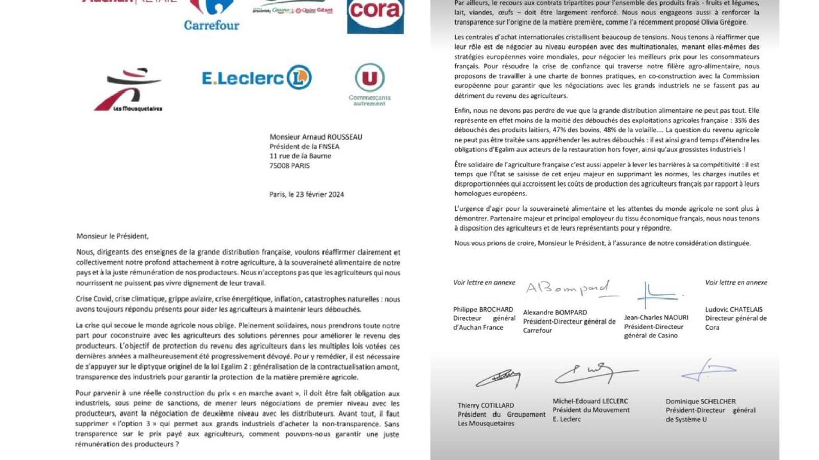 El mismo 23 de febrero que Alexandre de Palmas (Carrefour) enviaba una carta individual a Arnaud Rousseau, presidente de la FNSEA, los líderes de la gran distribución francesa también le remitieron una carta conjunta donde, al tiempo que muestran su compromiso con la agricultura, la soberanía alimentaria y la remuneración justa de los productores, aportan su visión de la situación a raíz de la crisis agrícola.