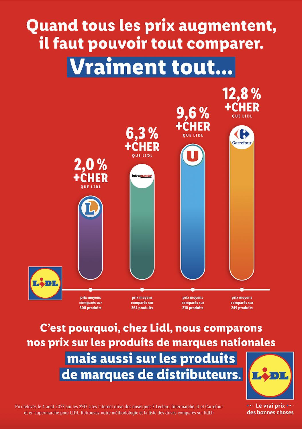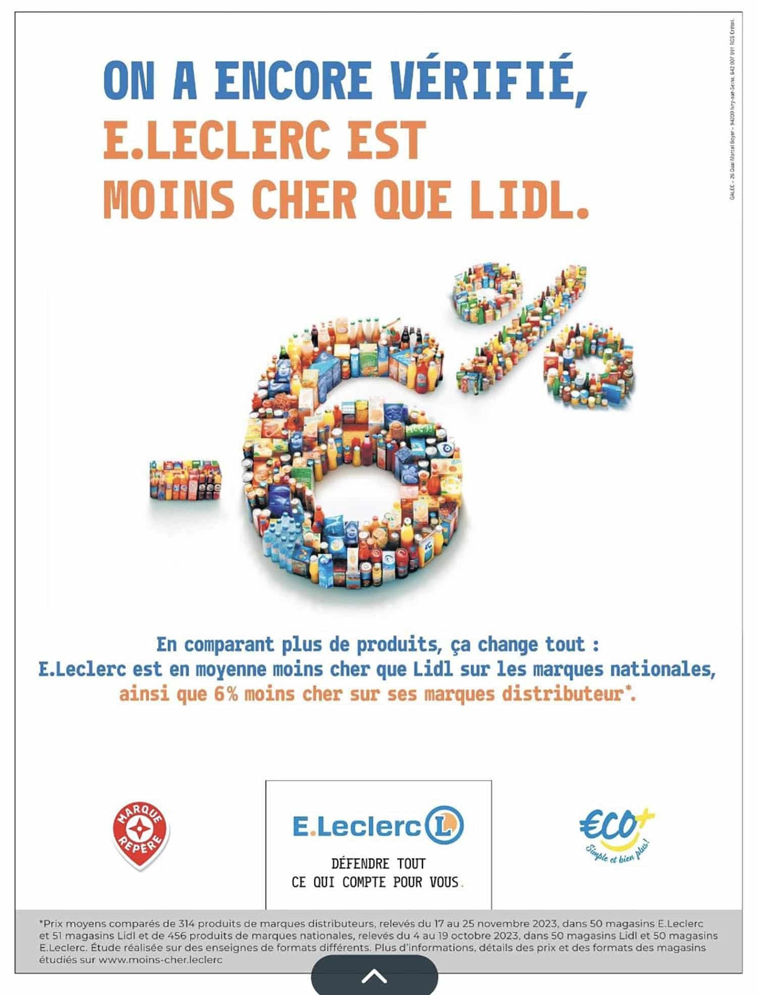 "Una vez más, hemos verificado que E. Leclerc es más barato que Lidl, -6%", reza la conclusión del estudio, convertida en panel publicitario. "Y, comparando más productos, esto lo cambia todo: E. Leclerc es de media más barato que Lidl en marcas de fabricante, así como el 6% más barato en marcas de distribuidor".