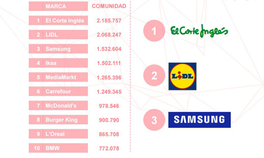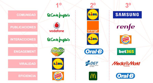Si nos fijamos en empresas concretas, son El Corte Inglés y Lidl las empresas reinas de las redes sociales, en un podio donde se cuela también Samsung. Las tres compañías son las que más seguidores tienen, superando todas ellas el millón y medio de seguidores, siendo El Corte Inglés y Lidl las que lideran también el apartado de interacciones y Lidl el de viralidad. En engagement sobresale Danacol, seguida de Oral-B.
