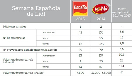 La Semana Española en los 25 mercados en los que Lidl opera fuera de España multiplicará sus cifras este año respecto a 2013. En concreto, se pasa de 20 proveedores españoles participando en la campaña a un total de 70. Se incrementa el surtido ofera de 47 a 225 referencias. Y, finalmente, se aumenta el volumen de mercancía suministrada por proveedores españoles de 14 millones a 160 millones de euros.