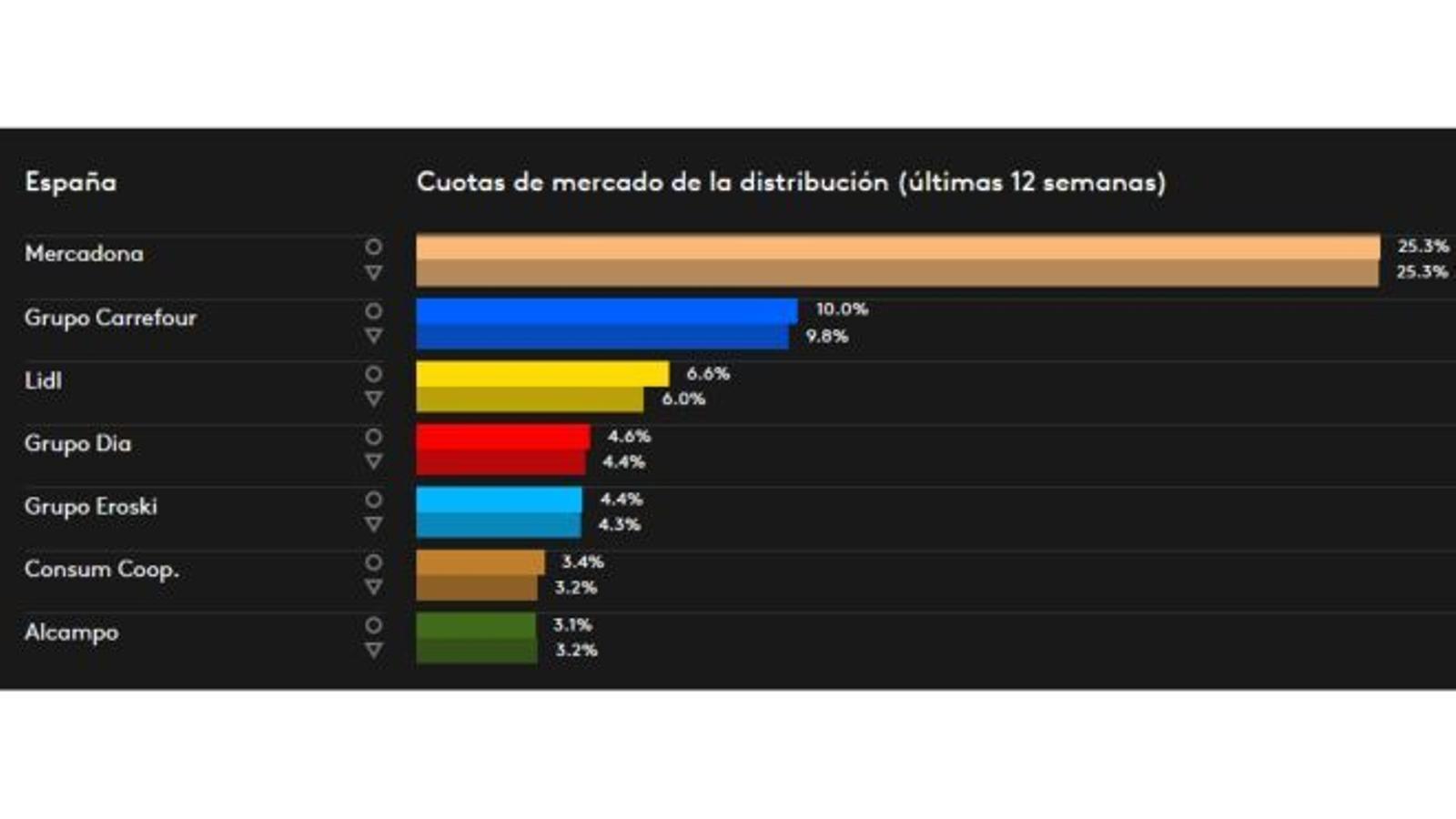 Dia (+0,2%), Eroski (+0,1%) y Consum (+0,2%) crecen también en cuota de mercado, aunque a menor ritmo. Entre las siete grandes compañías de distribución alimentaria, sólo Alcampo pierde una décima, aunque es plausible que sus resultados crezcan en el segundo trimestre como consecuencia de la reciente compra de 224 supermercados Dia.