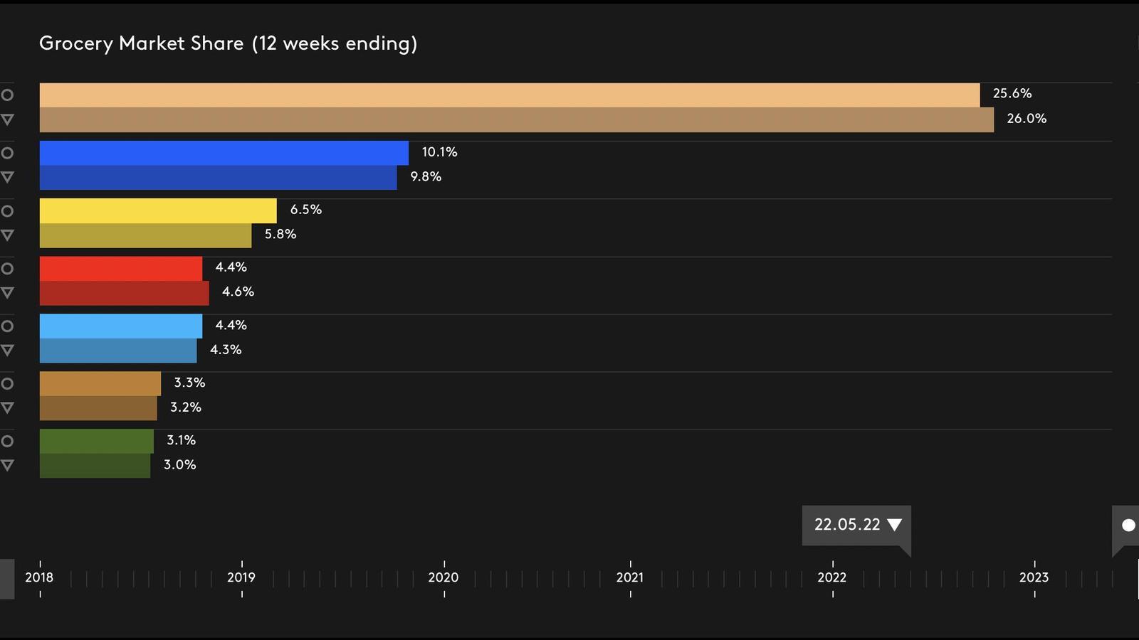 La cadena ha crecido cuatro décimas entre el 20 de abril y el 20 de mayo, alcanzando el 25,6% de cuota de mercado. Carrefour conserva una sólida segunda posición con el 10,1%: no crece y no disminuye. Lidl, que completa el podio, pierde una décima hasta el 6,5% de cuota, mientras que Dia y Eroski mantienen el empate técnico, sólo que una décima por debajo del mes pasado: en ambos casos caen al 4,4% de cuota de mercado.