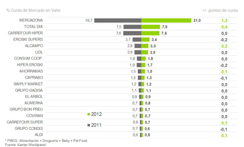 Es la cadena de distribución con la mayor participación en el mercado, la que más ha aumentado su cuota y la que cuenta con mayor fidelidad por parte de sus clientes. Mercadona copa el 21% del gasto realizado en alimentación, droguería, baby y pet food, lo que supone un aumento de cuota de mercado de 1.3 p.p. respecto a 2011, la mejor evolución de todas.