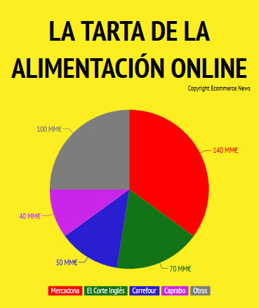 millones de euros (el 3% del ecommerce total). El segundo player con mayor facturación, a mucha distancia de Mercadona, es El Corte Inglés, con 70 millones de euros (17,5% de la cuota). Dentro de la tienda online de El Corte Inglés, la alimentación es la que más factura. Le siguen Carrefour (cuota online cercana al 12% y 50 millones) y Caprabo (10% y 40 millones). Entre el resto de grandes superficies que tienen tienda 100% online (Alcampo, Dia, Ulabox, Tudespensa…) se reparten el 25% restante, unos 100 millones.