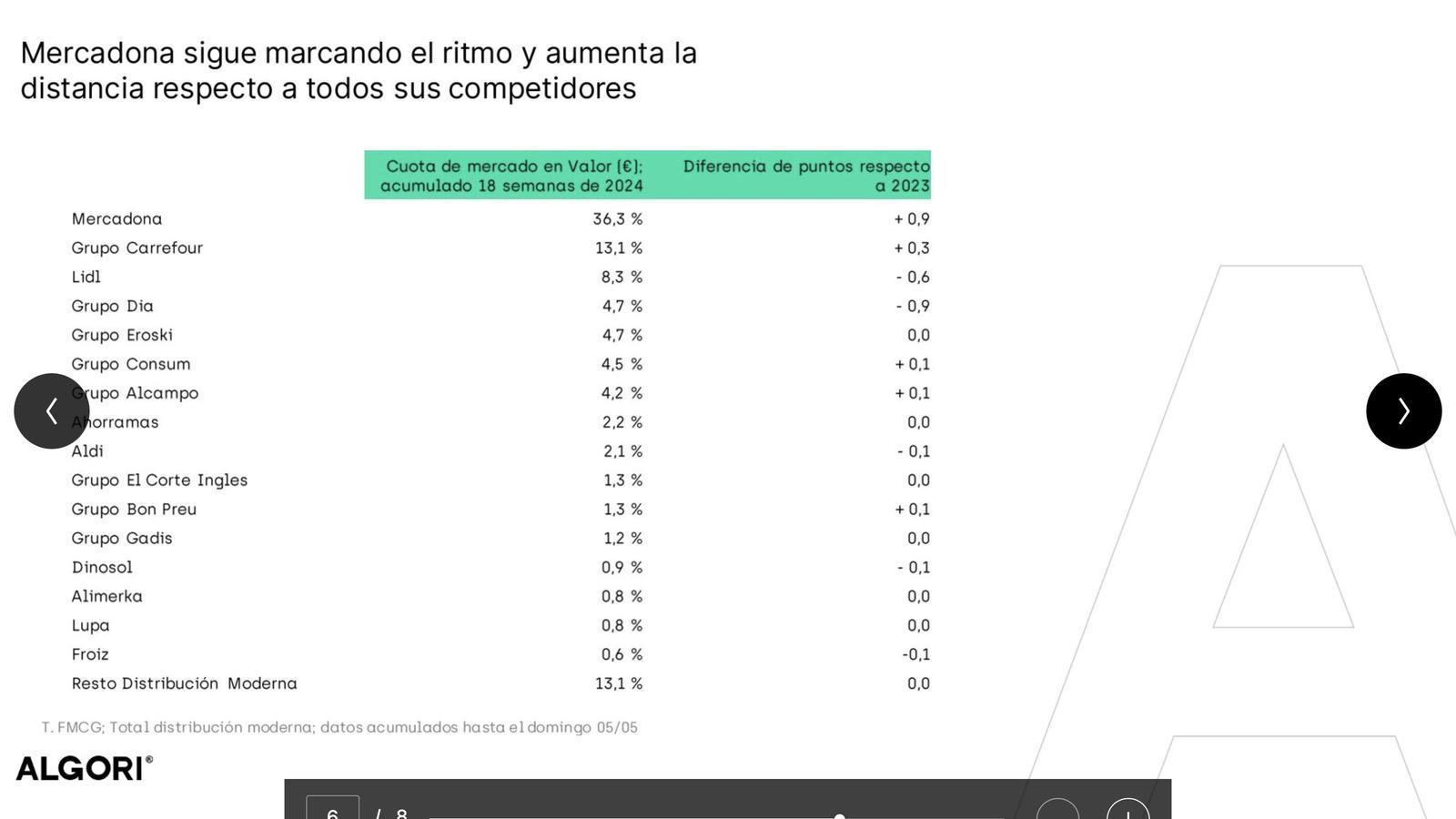 Completa el podio Lidl con el 8,3% en cuota, a pesar de haber retrocedido el 0,6% interanual.