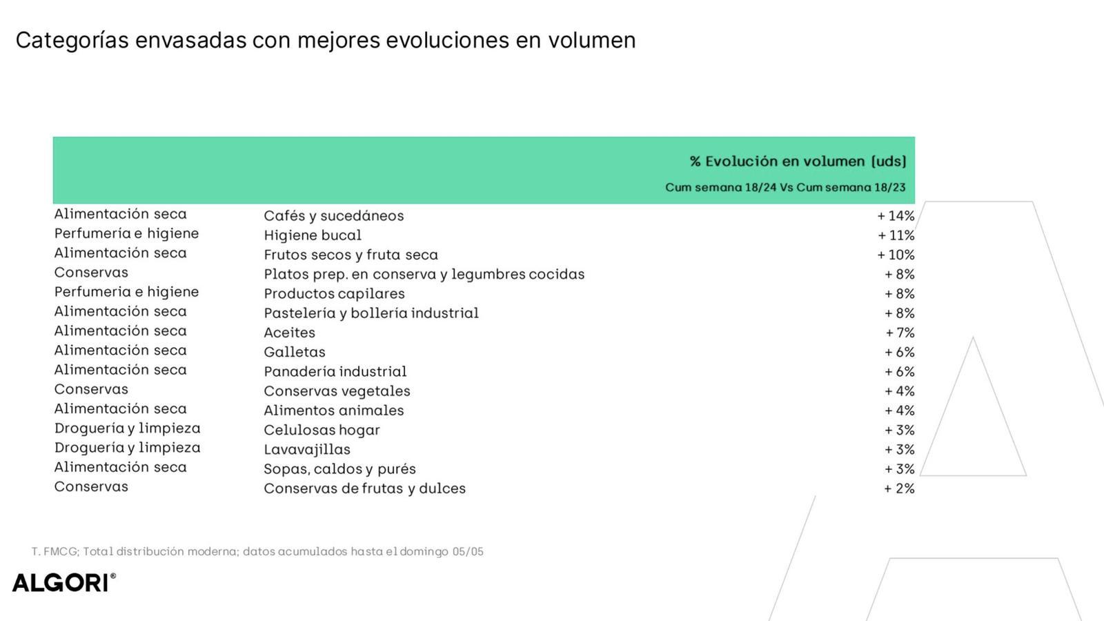 "Vemos cómo categorías que habían sufrido mucho en volumen el año pasado debido a los grandes incrementos de precios, como el café o el aceite, están volviendo a crecer en volumen; en este caso, el 14% y el 7% respectivamente", explica Xavier Cros, experto de Activando al Shopper y colaborador de Algori.