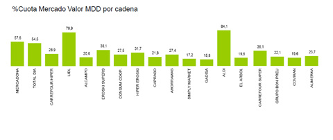 Tras los discounters y el indefinido Mercadona, aparecen el resto de operadores. Hay que destacar a Eroski y Carrefour, que son los distribuidores que preceden a las cuatro cadenas anteriormente mencionadas. En los supermercados del grupo de Elorrio (Center y City), la MDD registra una cuota del 38,1% sobre las ventas totales, más de seis puntos que en sus hipermercados. En cuanto a Carrefour, sus súpers (Market y Express) registran el 36,1%, siete puntos por encima de sus hípers.