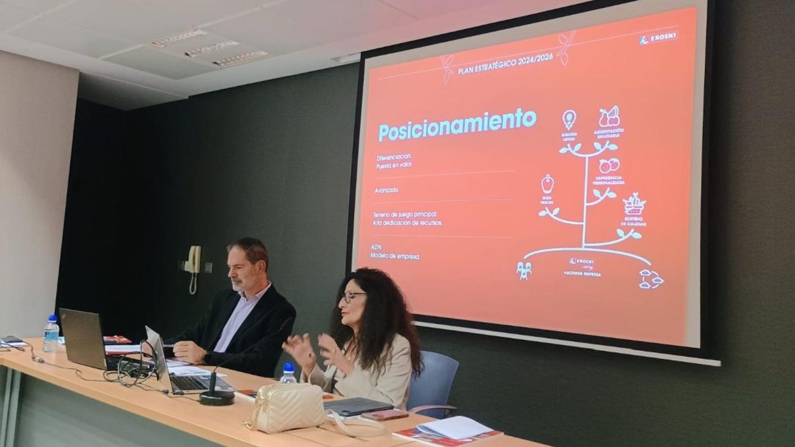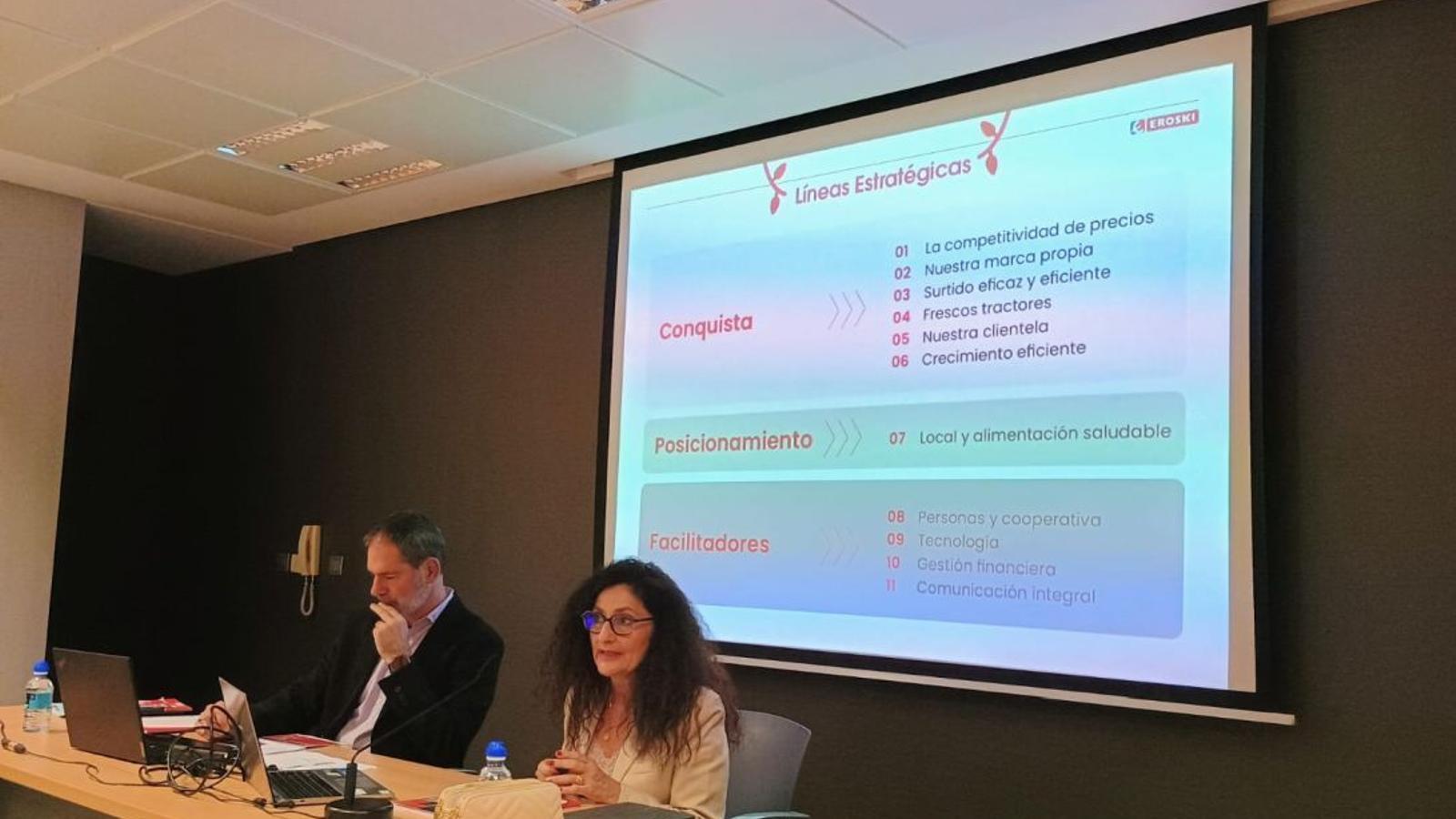Las 11 líneas estratégicas contempladas en el nuevo Plan Estratégico 2024-2026 de Eroski, "para tratar de ser cada vez más competitivos y relevantes dentro del sector", en palabras de Rosa Carabel, son: competitividad en precios, marca propia, surtido eficaz y eficiente, frescos tractores, clientela, crecimiento eficiente, alimentación local y saludable, personas y cooperativa, tecnología, gestión financiera y comunicación integral.