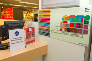 Entre los elementos accesibles que se han incorporado en Pozuelo hay que destacar el puesto de consigna debidamente señalizado con bucle magnético y mesa accesible, señales en tienda con contrastes de colores entre parámetros verticales y horizontales, indicaciones de estrechamientos de pasillos, tiradores especiales de muebles, planos en alto relieve y braille y los dispensadores de turno colocados a 1,20 m. Además, el personal de tienda ha recibido un curso de formación impartido por expertos de la Fundación Shangri-La para ayudar a los clientes que lo necesiten.
