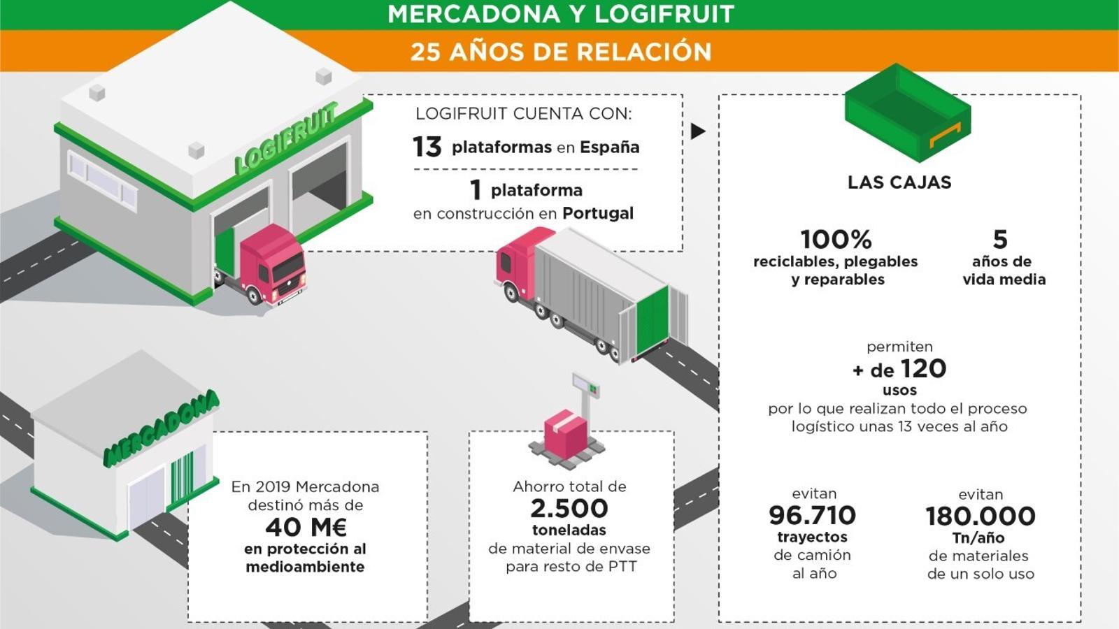 "La colaboración entre Mercadona y Logifruit, además, incrementa la seguridad, la eficiencia y la agilidad en el transporte de la mercancía; optimiza el reparto de rutas; mejora el flujo de productos hasta el lineal; optimiza el volumen de entrega a proveedores y refuerza la trazabilidad", precisa la cadena.
