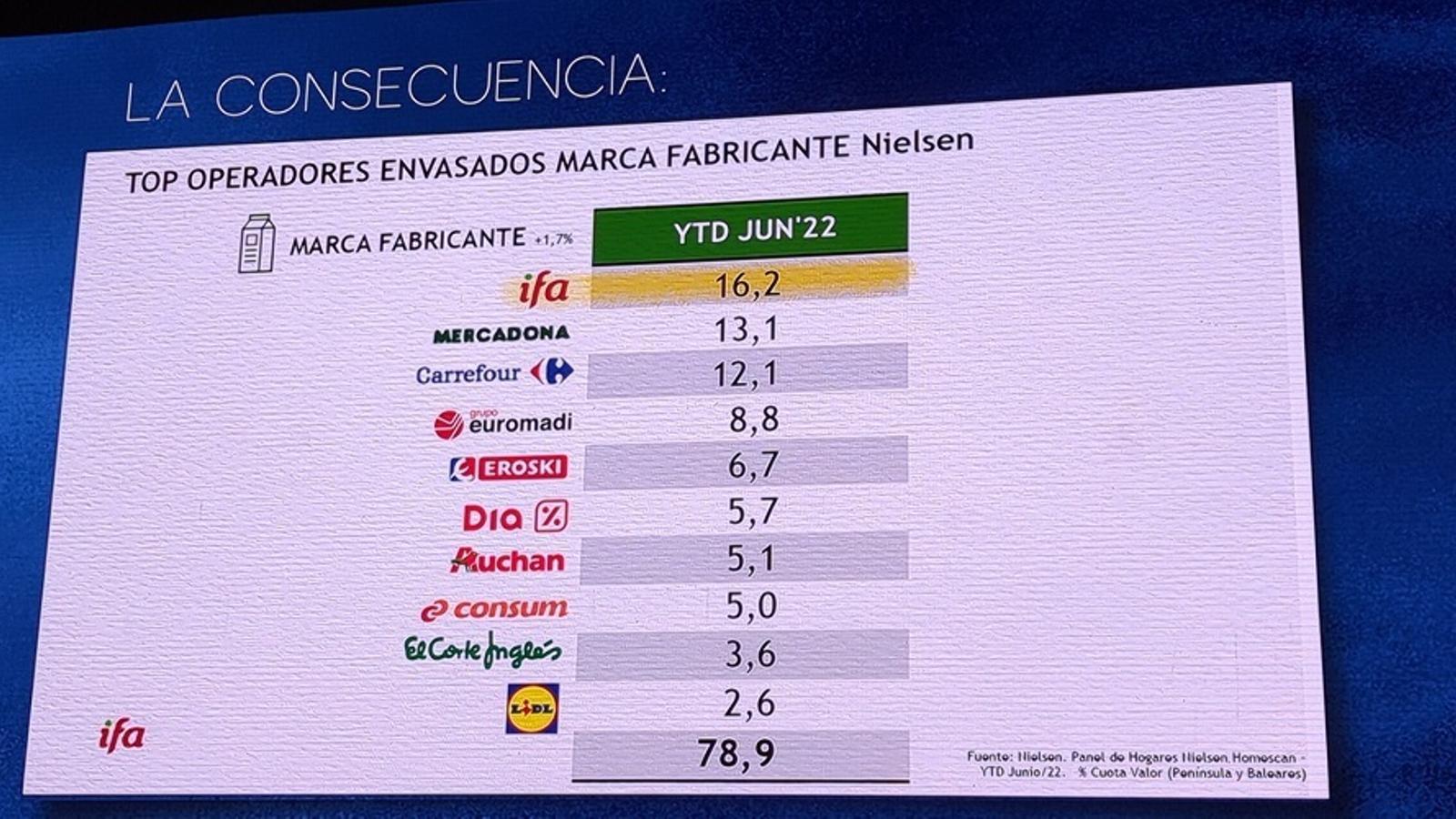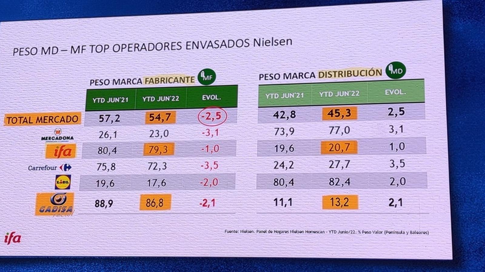 En contraste aparecen otras compañías que tienen una mayor apuesta por la marca de fabricante. Así, el Grupo Ifa apenas ve aumentar la cuota de su marca propia, desde el 19,6% hasta el 20,7%. Por su parte, las ventas de Gadisa reflejan que el 13,2% de su facturación corresponde a la marca de la distribución, frente al 11,1% del año pasado. Por último, cabe mencionar a Carrefour, que pasa del 19,6% del año pasado al 20,7% de este 2022.