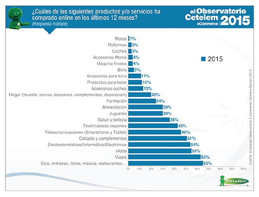 Los productos menos adquiridos en el canal online son los relacionados con el mundo del motor, como es el caso de las motos (1%) y de los coches (3%).