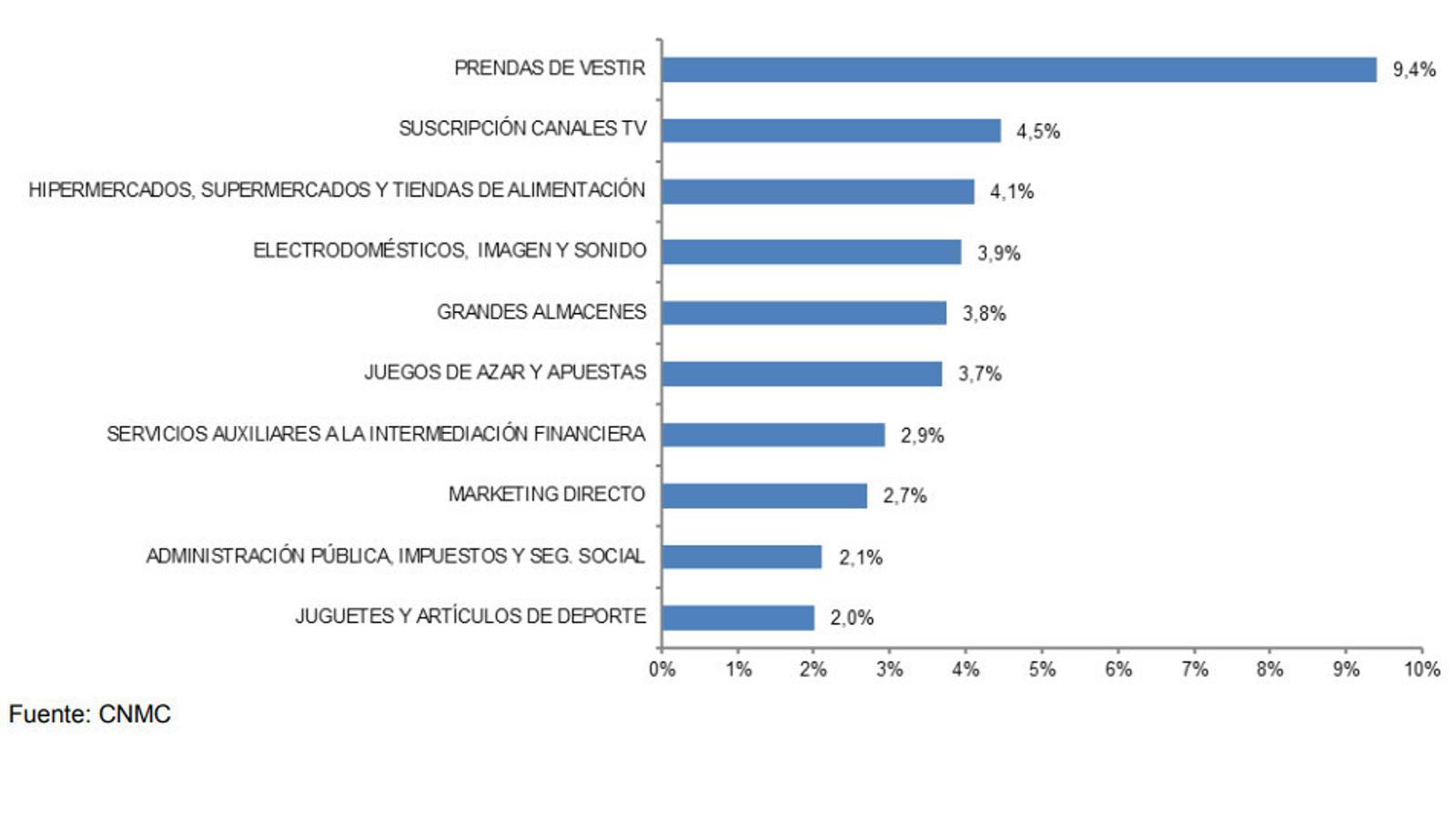 Los ingresos de comercio electrónico dentro de España (compras hechas en España a webs españolas) aumentaron el 0,7% interanual hasta los 3.819 millones de euros. Lideraron la facturación dentro de España, los electrodomésticos, imagen y sonido (9,7%), seguidos de los hipermercados, supermercados y tiendas de alimentación (8,8%).