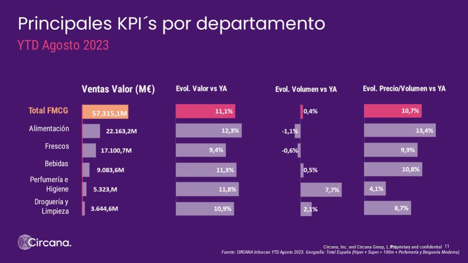 Por canales, el canal especialista de Perfumería e Higiene Moderna es el único que registra una demanda en volumen positiva (+11% YTD agosto´23), con el incremento de precio más moderado de todos los canales, +3,8%, muy por debajo del incremento medio.