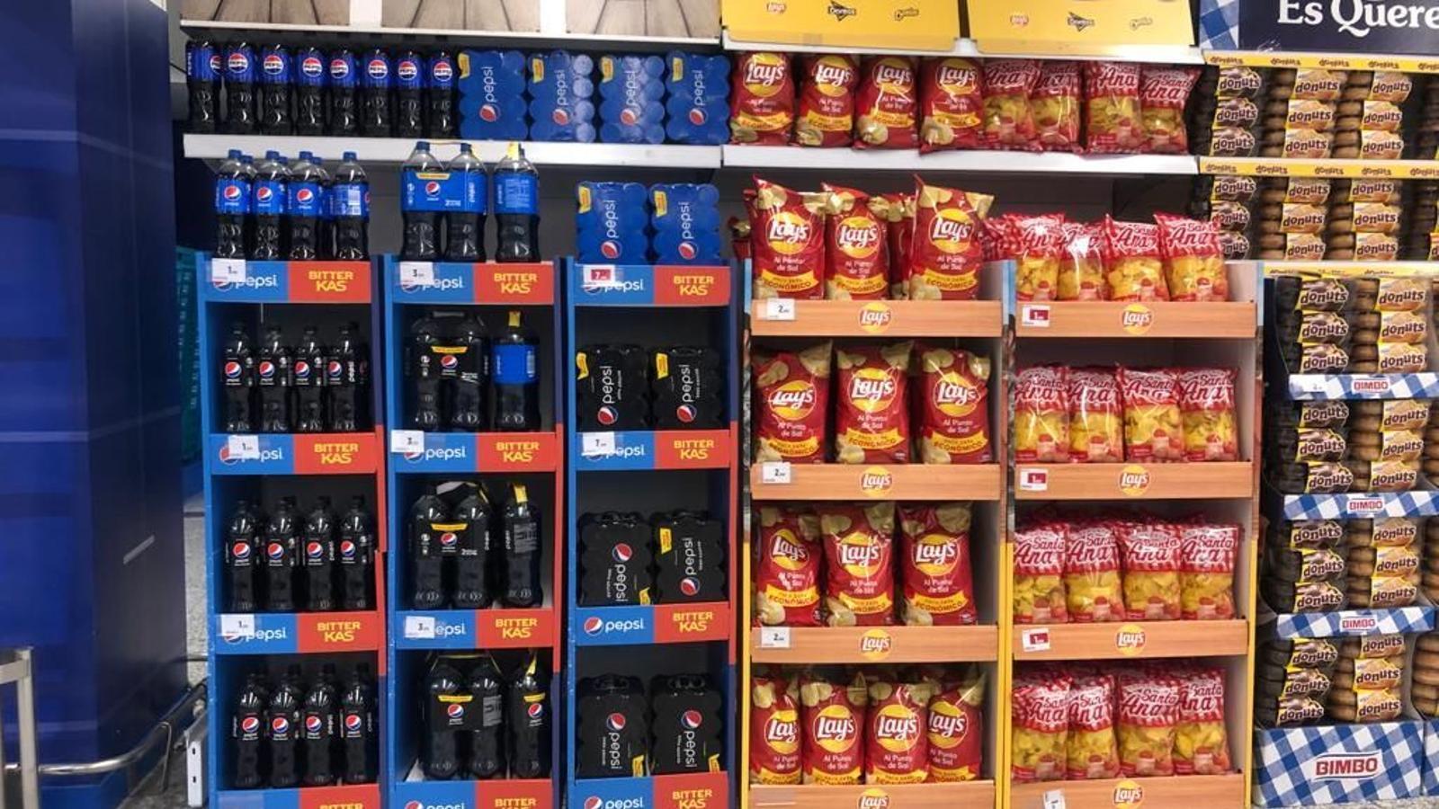 Así puede verse en estas imágenes del Hipercor de Alcalá de Henares (Madrid) que nos envía un fiel lector, en las que se aprecia el destacado espacio que ocupan las estanterías de las marcas Pepsi, Lay's y Santa Ana (las tres pertenecientes al grupo Pepsico) y Donuts (propiedad de Bimbo).